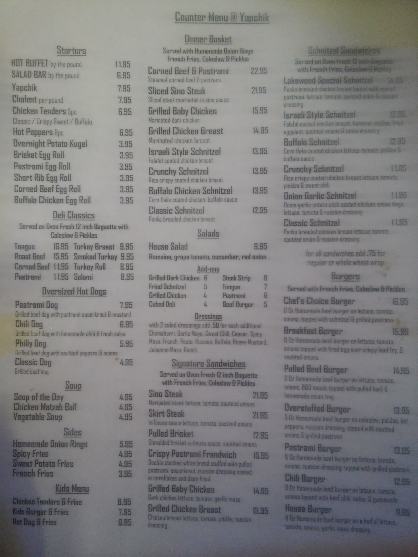 Yapchik has a full menu of meats, deli, chicken and salads. We met up with some friends for lunch and enjoyed the good food and nice atmosphere. The place is very clean and the staff is helpful. The food was set up buffet-style so you can come and fill up a plate with whatever you'd like to eat. Then you weigh your food and pay a set price according to the weight. There's a small parking lot in front which was large enough for the amount of cars when we went. We went for lunch so there weren't too many people. But I'd imagine that it's jam packed for dinner. So keep that in mind as far as finding a parking spot. At the entrance, there is a ramp next to the stairs, perfect for someone with a stroller or in a wheelchair. We were very pleased with the whole experience and I'm sure you...