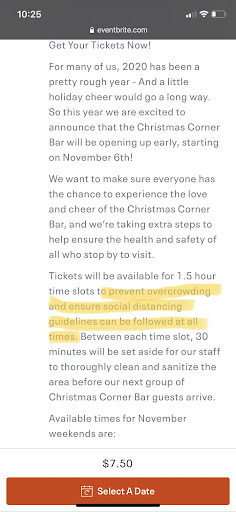Tonight was another story. My group paid about $60 to reserve a table at the Christmas bar. The ad was clear: we sanitize tables in between groups, we limit the amount of people in the room to allow for social distancing, etc. The ordinance is clear, you wear masks when you're not eating or drinking, or your bar gets shut down. We felt comfortable making this move.