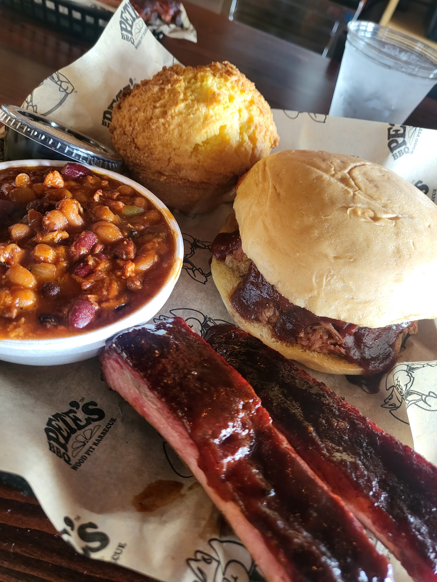 Read moreI get my hair done near BBQ Peteâs and it always smells so good. So on Friday I decided to stop in! Itâs decorated like a southern BBQ hall with picnic tables and such! I saw the awards displayed on the wall and felt good about eating there. I ordered the Brisket sandwich and one rib. I wanted the coleslaw but was skeptical, and the lady taking my order let me try it and it was a thumbs up! I took my order to my car and wanted to try the food before I headed home. I first tried the rib, it didnât have a lot of sauce on it, I really canât remember because I ate it so fast! The meat was so tender and delicious and I considered going back in to order a slab of ribs. After scarfing the rib down, I tried the brisket sandwich. It was deliciously flavorful. Thereâs a smoky sauce on it that I could have had more of! I added the coleslaw to the sandwich and that changed the game! I sat in my car deliberating on if I needed to get more food. Once my sandwich was done I decided that I needed an order of ribs. I went in and the server asked me was I back for more lol. I ordered a half slab of ribs w/ 2 sides, the coleslaw and the baked beans. Me and my daughter enjoyed that meal the next day! I hate I had to...