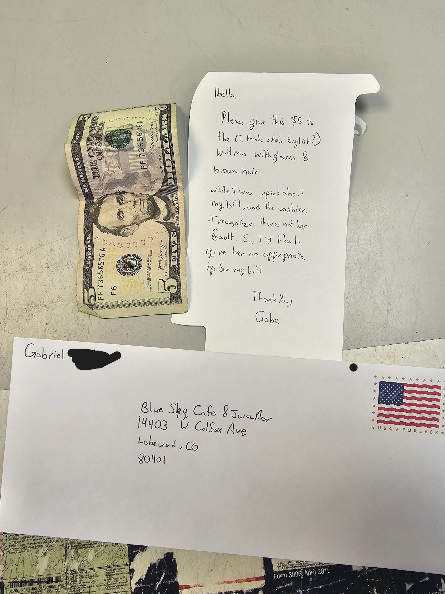 So, I tipped 10%. This cashier just really made my whole experience unpleasant. She was bad-mouthing me to a co-worker before the door had even shut behind me. That said, it was not my waitress' fault I was dealing with such a sour person. I tipped 10%, but that just isn't right. So, I've posted a letter I sent not an hour after my visit. That is a more appropriate tip for my $20 bill. I hope the waitress gets it, I did not catch her name.