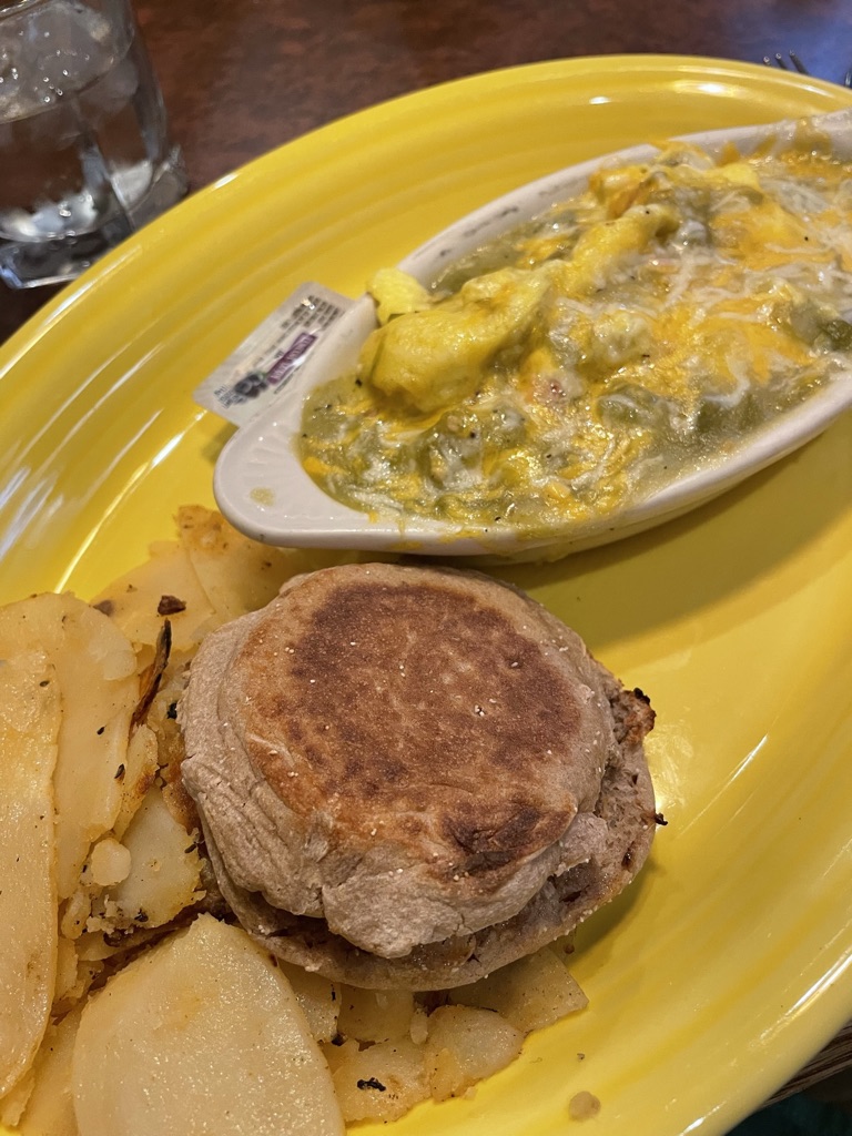 I ordered the great American breakfast with biscuits and "sausage" gravy. Came with 2 chalky caned biscuits with a extremely bland white gravy, no seasoning, and no sausage at all in it, tasted like glue. 2 tiny strips of bacon, some overcooked crunchy potatoes and eggs scrambled with no seasoning or cheese, asked for a little sprinkle of cheese on top but was told that was an extra 3$ bucks, i declined. My daughter had the avocado and bacon cheddar omelet...came with hardly any cheese inside, microscopic pieces of bacon, and same overcooked potatoes with 2 tiny english muffins. She ordered a tiny little side of hollandaise sauce that was the size of quarter in a baby ramekin that she said also was terrible...sauce was also $3 extra and broken, (liquid, not thick creamy sauce, that was clearly noticeable and runny) I had a house coffee, she had a specialty coffee the pistachio latte that was $10. Just these few items! Nothing else came with a bill that was $55 dollars without a tip!!! Making this meal with a tip over $65 dollars!! Yikes!!!