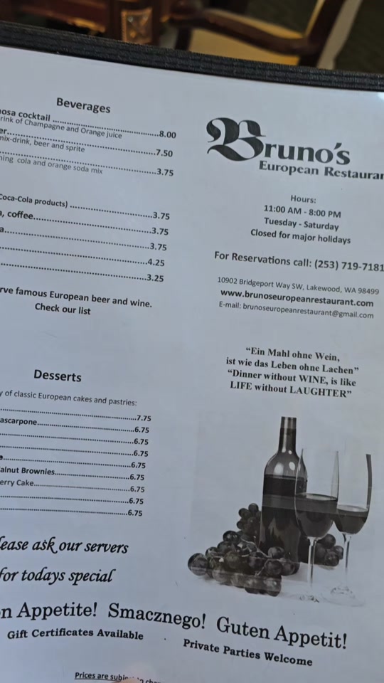 Read moreI write this review with great disappointment. Last week in St Patrick's day I took my family to Brunos for a treat. We lived in Germany and Brunos has been one of the few authentic places innthis state tonget.good German cuisine. Have been going there for years, but not frequently because it's not inexpensive. This was my second time at their latest location and with it being st Patrick's day, it was quite dead. Which I was kind of happy about because every time I've been in the past its been quite busy. We were seated quickly and our waitress was the older lady, whom I assume was in charge. She took our orders and had kind of a grumpy attitude but was tolerable. There were three tables with people in the restaurant so they were cutting staff. Lack of business did not do good things for our service. Our waitress forgot one of our entrees that we retrieved ourselves from the cook. After our initial drink order, we were never offered more. She seemed bothered by our toddler who was a bit fussy but I took him outside when he got loud out of respect for the other patrons, even though restaurant was empty. The food was bland and my rouladin was beyond basic. I do better in my own kitchen. The bill was large, the service was poor, and the food was not the quality I've come accustomed to. Though every time ive been in the past, Bruno himself was doing the cooking which was always amazing. Unfortunately, now I will be hard pressed to return for my...