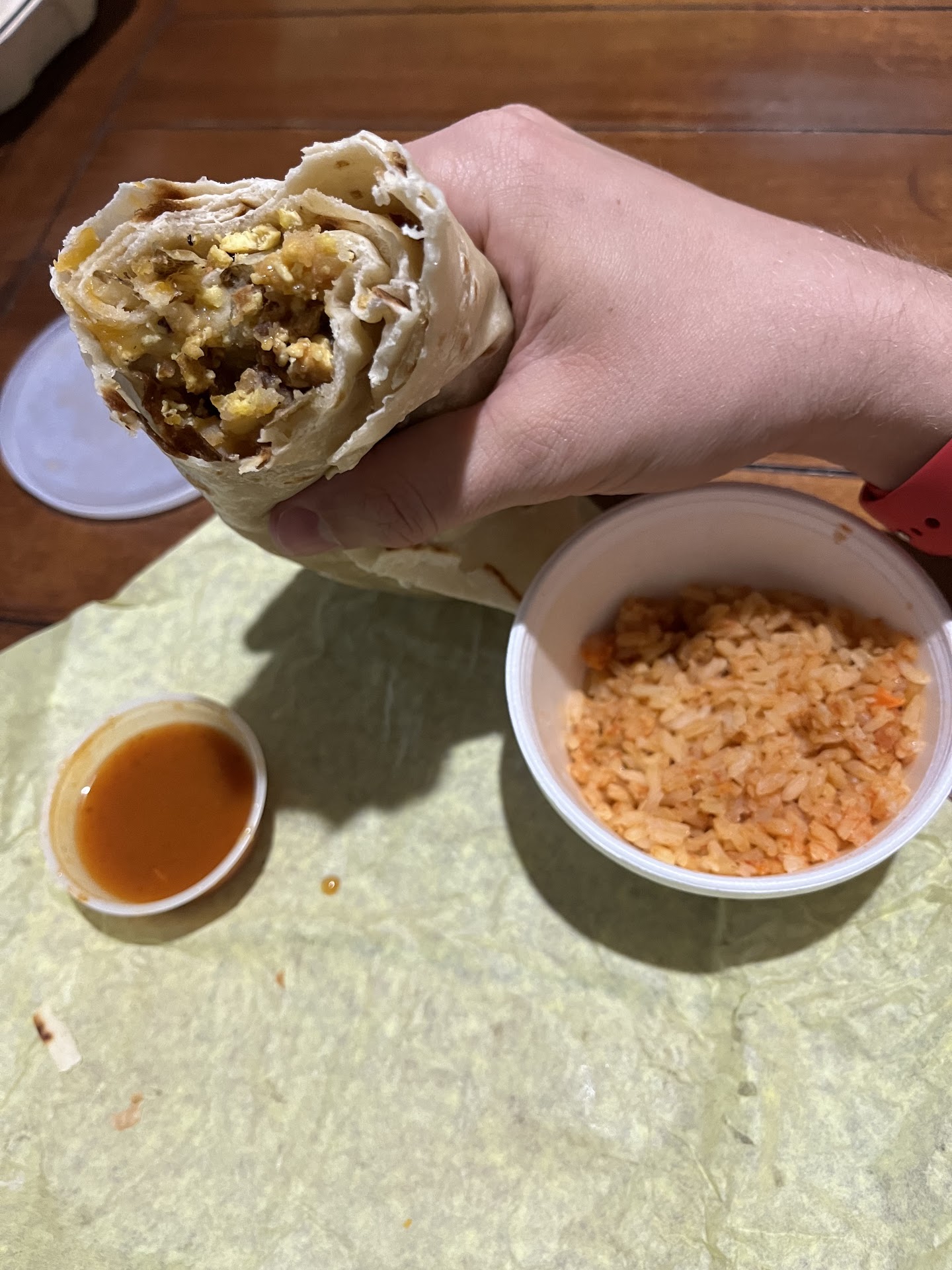 I ordered a breakfast burrito: bacon, cheese, potato. I also ordered a bean and cheese burrito for later. The breakfast one was filled with crispy bacon cooked the way I like it, but I found no cheese and only a little bit of potato in the last two bites. It was tasty, just not what I expected. They certainly didn't skimp on the bacon and you cannot be hungry after the burrito I just consumed. As for the other burrito, I'll know later.