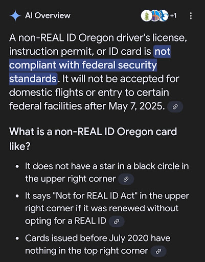 “A non Real ID Oregon drivers license, instruction permit or ID is not compliant with federal security standards. IT WILL NOT BE ACCEPTED FOR DOMESTIC FLIGHTS OR ENTRY AFTER MAY 7 2025 . It says “NOT FOR REAL ID ACT “ on the upper...