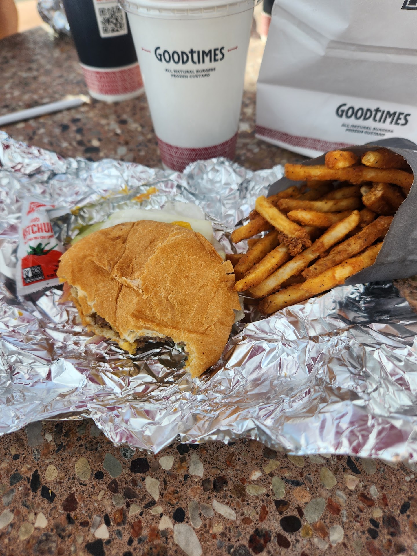 Read moreSo we love Good TImes. It is the only hamburger fast food joint that my husband can eat without digestion issues, the wild fries are the best fries ever, and we love the fried pickles. We love that they are open so late since neither of us are off work before 9:30 or 10. This particular location has always been spotty on service and quality, but in the last six months we have seen it taken a sharp downhill turn (and we are frequent diners since this is the closest location to the house.) The last several times they have gotten an order wrong, forgotten to take off certain things or left off a side item. The burgers have gotten continuously greasier to an almost McDonalds-like consistency. Tonight was bar none the worst service and quality of food I've had at a Good Times. The person taking our order kept interrupted my husband to ask questions he was in the middle of answering. The bottom of the bag was so greasy that IT BROKE before we even got to the front door of our house. Fries were a total loss, my husband was able to salvage a few onion rings, and thank god the burgers were fairly well wrapped (but not like, fantastically wrapped. The bacon of my Big Daddy's was sticking out of the foil.) To add insult to injury, my husband's lemonade was fizzy and tasted rather rancid, like the machine needed a good cleaning. As I said, I love Good Times, but I think we're going to find another location to go to, even if it means adding 15 minutes to our...