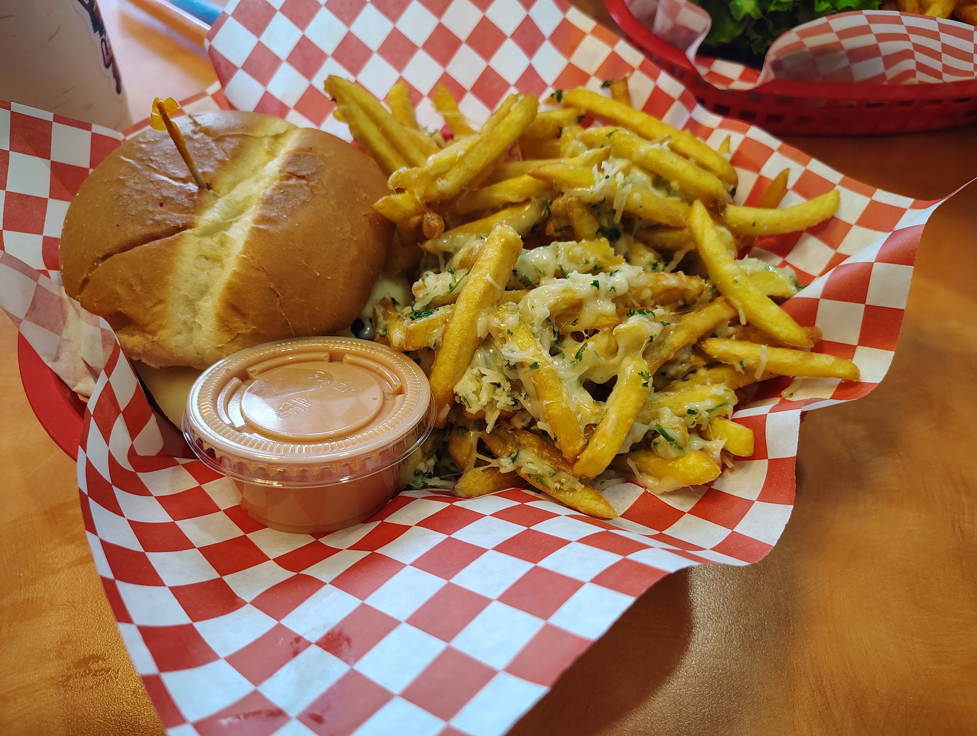 As for the food, it doesn't quite live up to the hype of the environment, but it still delivers a solid meal. I ordered the jalapeño burger, which was hearty and satisfying. The portion size ensured I didn’t leave hungry, but the flavor wasn’t as bold or unique as I hoped for. My wife had the classic cheeseburger, which was simple but tasty. Both burgers were filling, though the flavors could have used more of a standout twist. The garlic Parmesan fries, though filling, didn’t wow me either, though the accompanying fry sauce definitely added a nice touch.