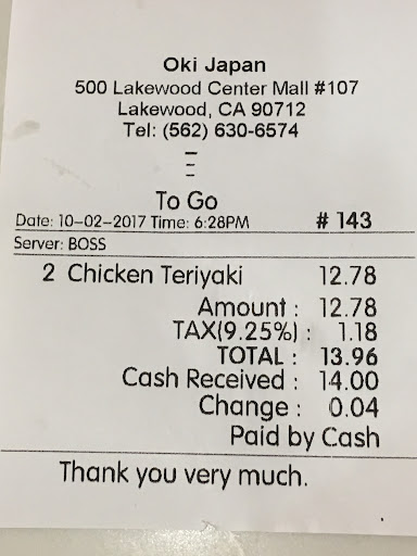As long as you don't order the sushi, then Oki Japan is a good option when the hunger pains strike while shopping at the Lakewood Mall. For not much scratch, a hot plate of teriyaki can fill you up. Next time, I'm going for the beef...