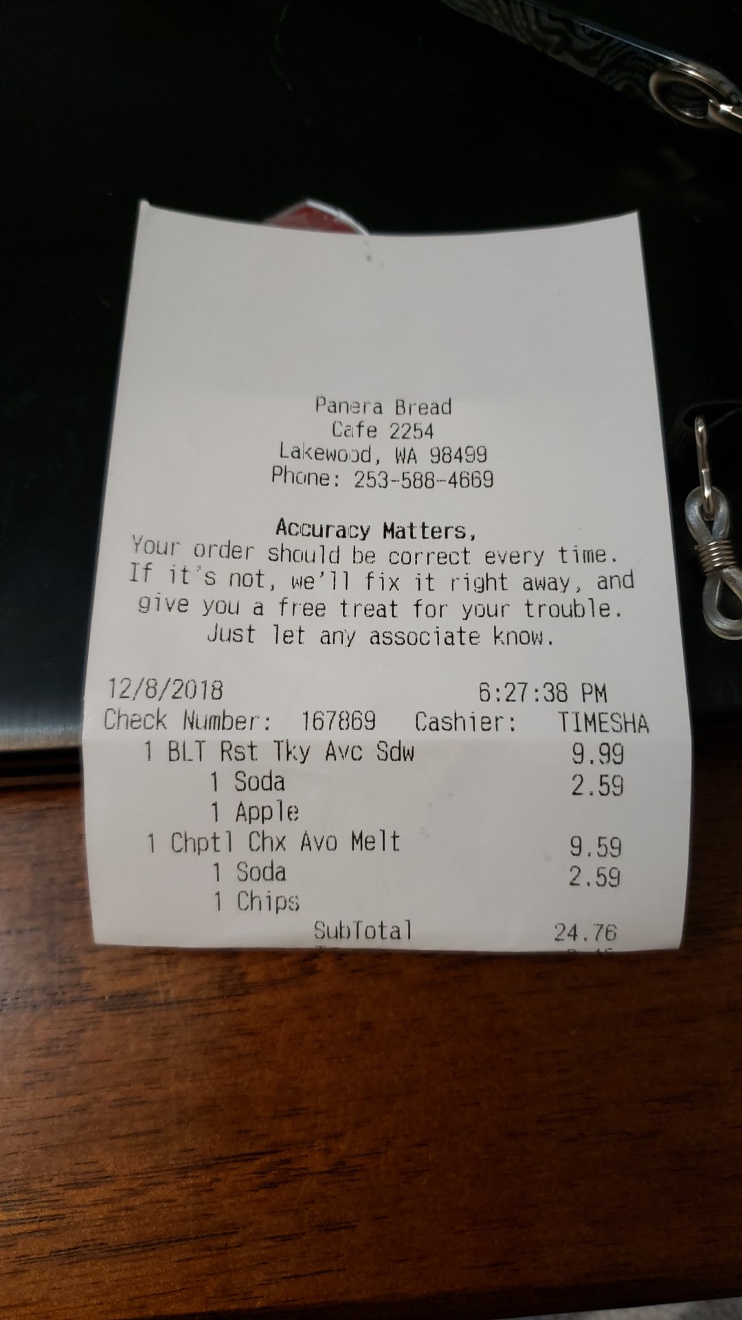 Normally I love panera. It is one of my favorite restaurants. I order from this one all the time because it's the closest location to me but I have decided to start going to the Tacoma mall location instead. As far as the food goes this location is never consistent . I almost always get a green goddess salad. They never make the dressing the same, it's like sometimes they forget to add ingredients and it's so thick, has no flavor and won't run out of the little containers..its more of a plop. Kind of gross. They also aren't consistent with their measurements. A part of the reason a lot of us eat at panera is because we are counting calories. I always ask for extra dressing because sometimes those little cups are full and other times they are barely a quarter full. This location is also consistently out of ingredients. It tends to be the same things almost every day. When you notice that you go through a certain amount daily, perhaps you should keep more on hand. The worst thing that deterred me from this location, and this is about a year ago, was the way I witnessed them treating an employee. I brought my family who was visiting from out of town to dine in. I visit this location almost daily so I've started to recognize some of the staff and their roles in the resturant. The resturant manager and another woman appearing to be from corporate were reprimanding an employee in the middle of the dining room where us and surrounding guests could hear. From what I gathered the employee is one of the lower people on the totem pole. Every time I'm in the resturant he is working. I've never seen him standing around. He is constantly asking people if they need help, cleaning, etc. He was being accused of coming to work too early. It appears as if the kitchen staff find him annoying, so in turn they had told management that he said obscene things to them. I've had conversations with this employee before. He is one of the nicest employees in this establishment and I don't believe he said a word of what they were accusing him of. He begged and pleaded that they believe him when he said he would never say anything like that to anyone. I believe him. When he was accused of saying these things he all but burst into tears. They continuously bashed him and talked down to him like a child. The severity of what they were accusing him of was very minimal yet they continued to scold him until he looked as if he was ready to cry. I don't care what he did or didn't do. Management had no right to treat him that way, especially not in front of the entire resturant. It was unprofessional and unfair. They actually said that other than coming to work early (which used to be a good thing) the only proof they had of any other wrong doing was some of the kitchen staffs word against his. I've heard the kitchen staff swearing, and goofing off on multiple occasions, yet I've never seen this employee act unprofessional in any way. What really got me was after they yelled at him for 20 straight minutes, told him they were taking two days work away from him, and sent him home, the managers who did this proceeded to sit in the dining room and make fun of him after he left. It was disgraceful and I think this employee needs to be compensated for being verbally harassed at work and in front of customers. This was at 3:00pm on Wednesday Sept. 13th 2017 at the location in Lakewood, Washington on Lakewood Towne Center Blvd. It's hard to support a place that treats their employees this way. Everyone is just trying to make a living. How many zeros that are in corporates bank account should not be what matters, the employees and their quality of life is what should matter. I hope for his sake he finds employment elsewhere where he isn't treated like a piece of trash. I sent these concerns to multiple different emails and forms from Paneras website over the last year and have yet to get a response so I decided it was time to...
