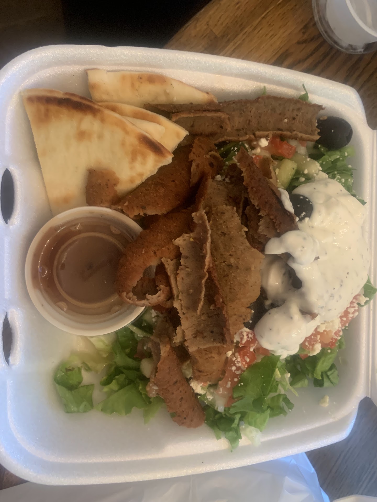 Read moreGreek Salad with 3 Falafels: falafels are crispy on the outside, soft on the inside, great with Taziki. Salad is loaded with fresh tomato, cucumber, white onion, and feta; tastes fresh.