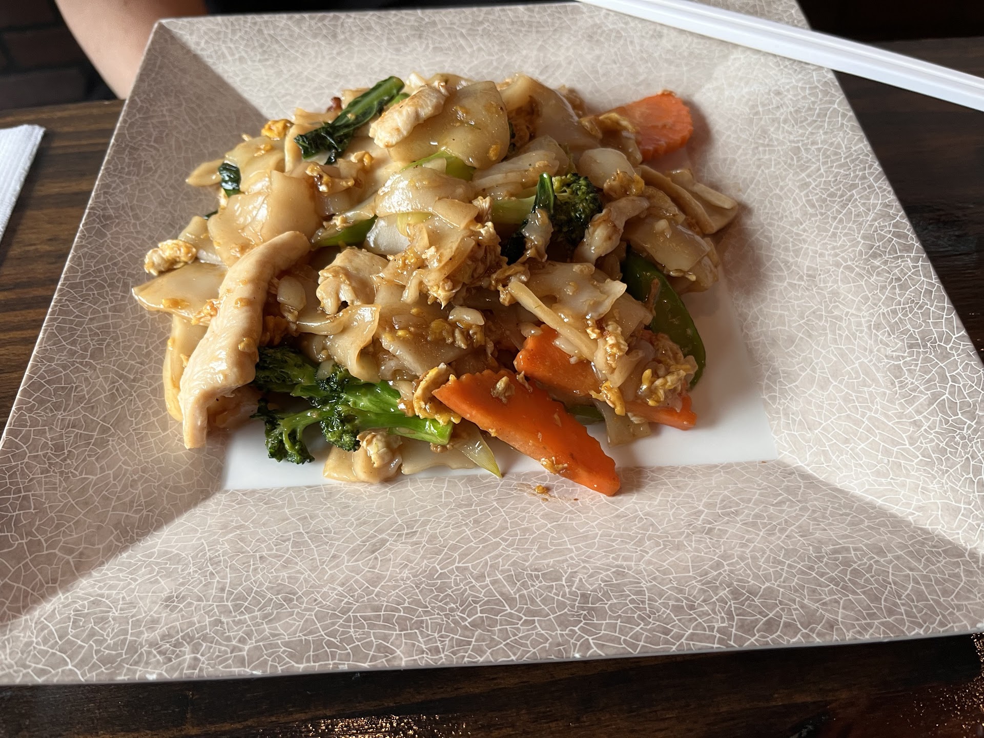 Read moreUpon walking into the restaurant the first thing that hit me was a very strong smell of cleaning substance like pinesol or similar. I guess the smell could of been something worse. We almost turned around and walked out but were greeted by a male employee who showed us to a table. Luckily it was the one by the front window and there was a floor vent with cool air coming out. So we either got used to the smell or that vent helped a lot! We both ordered a thai iced tea which was refreshing. Then we placed our orders. We first ordered the 4 vegtable spring rolls. And then we ordered our entrees. My sister ordered the Pad Thai with chicken and I the Pad See Ew with chicken. Our entrees came out but apparently he forgot the spring rolls. We asked about this so in a few minutes he brought some out. Unfortunately we could have just forgotten about them as they weren't very good. They didn't have much of any vegtables in them and sort of an off flavor. The entrees we're flavorful though. It was a bit of a let down as I have been looking forward to coming here. There are so many other Thai restaurants in this area and it had made me wishing I had taken my sister elsewhere. She had been visiting from Arizona and had a taste for Thai food. With that said I may try them again in the future but not untill I go to some other Thai restaurants. They were not busy during our visit with only one other diner at first then when he left a group of three...