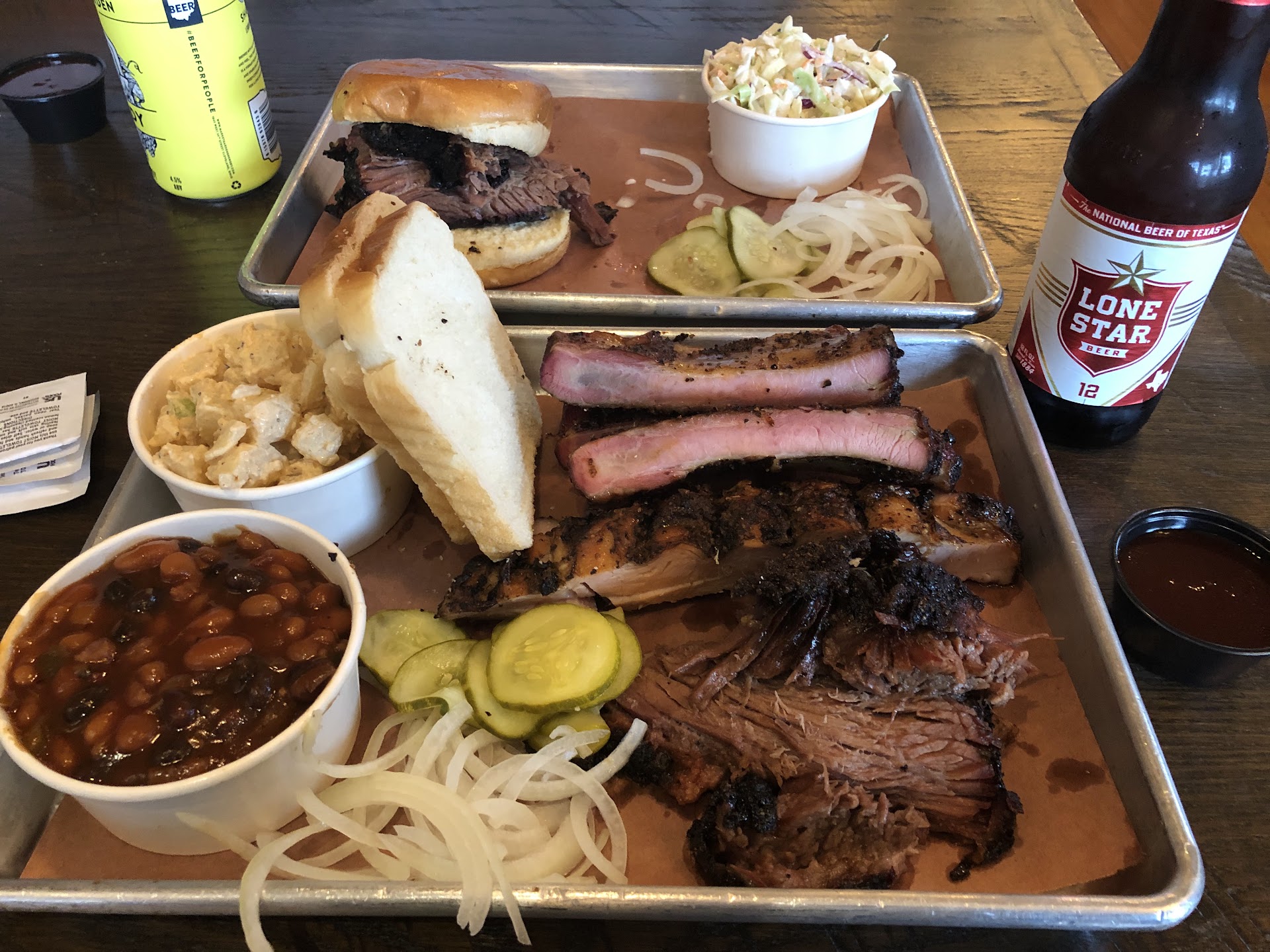 I ended up getting the brisket, the pork ribs, and the turkey breast, in addition to potato salad and the smokehouse beans. My wife had the brisket sandwich and cole slaw, both of which she enjoyed. I enjoyed the flavor and bark of the brisket, but I think it might have been cut with the grain, rather than against the grain, which made cutting it somewhat difficult. Otherwise it was good brisket. The pork ribs were fairly simple - I think the rub is mostly salt and pepper and they don’t put any perceptible amount of sauce on them prior to them being served. Instead, a sweet-tangy sauce is available which is quite good. I think the ribs are cooked to the proper amount of tenderness so that they are tender, yet don’t quite fall off the bone. Finally the turkey was very good. Again, it seems like it’s probably a simple salt and pepper rub and the turkey ends up being very peppery. If you like pepper, it’s great, but if not, it won’t be your cup of tea. The turkey is moist and tender.