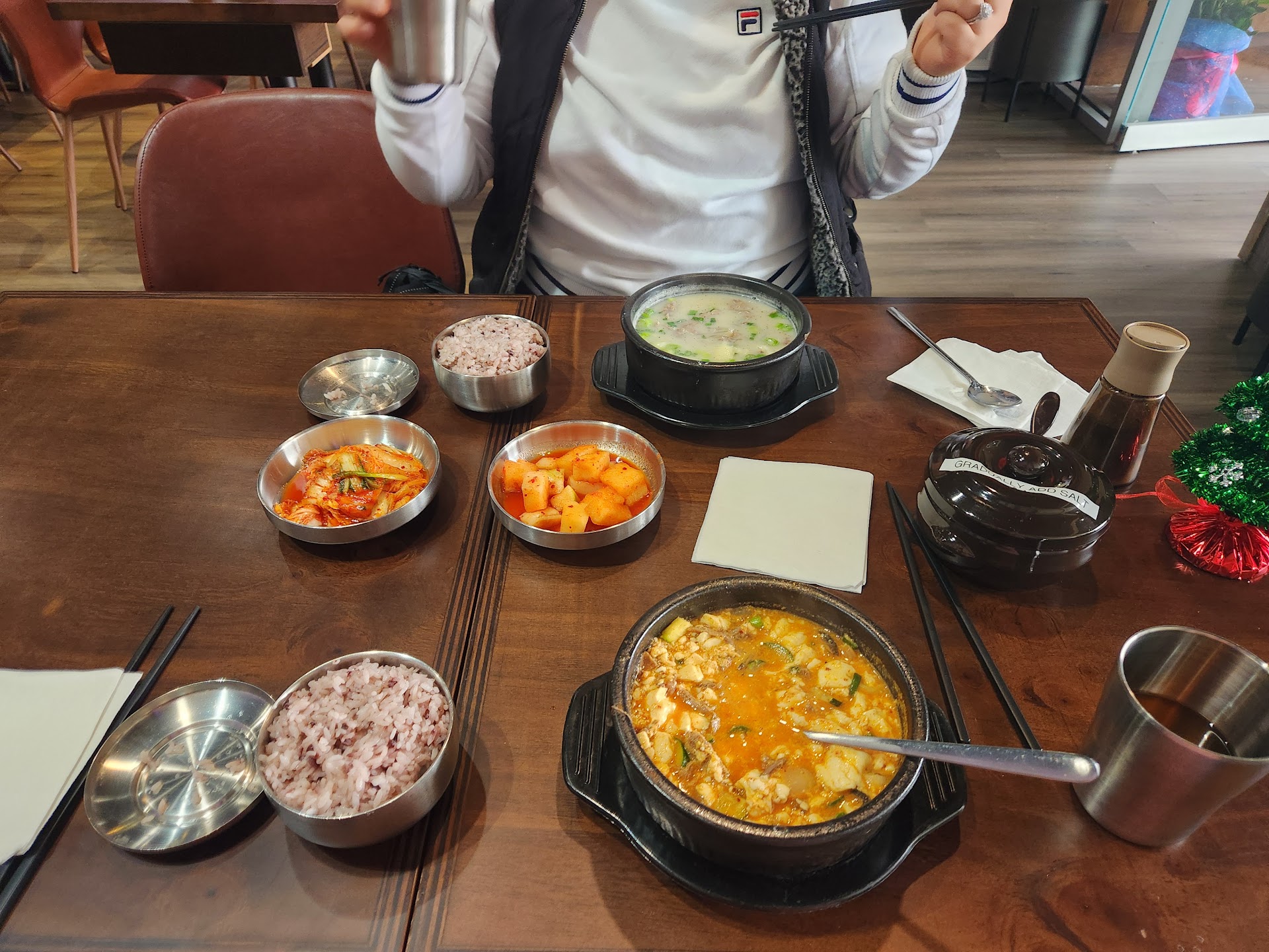 The food — I loved it. I had the 섞어 설렁탕 (cannot remember what that was in English…), and I personally think the broth was almost thicker(?) than the broth at the Federal Way Yi’s. The meat was plentiful, too! I take it out and set it on the lid of my rice bowl to let it cool for a bit, and the meat was overflowing. Both kimchis were delicious, and we got a second helping. My husband got the mandu, and I he enjoyed them quite a bit. I don’t really liked steamed mandu, but I also enjoyed it.
