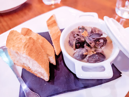 After being seated at our reserved table we ordered cocktails. Basic for the boys and a couple of "adventures" recommended by our server for the ladies. Whoo hoo, adventures landed and remorse found me looking down at my old standard - old and standard. The bartender had the Parisien down. Even the lively bar scene filled with the sounds of a Paris bistro. On to the menu and appetizers and wine list with more choices than entrees. Foie Gras, Caesar salad, pate, escargot and a few more adventures.
