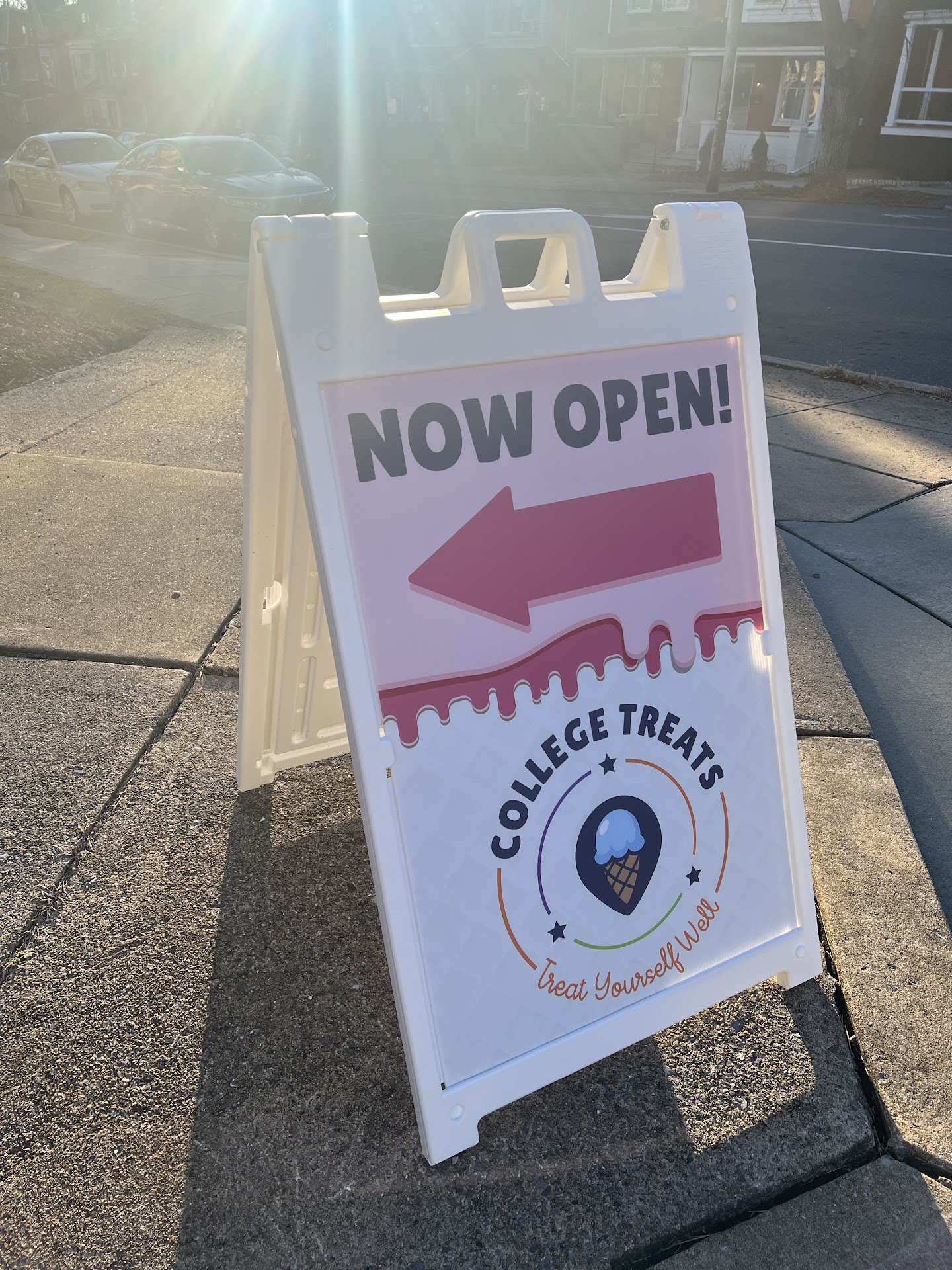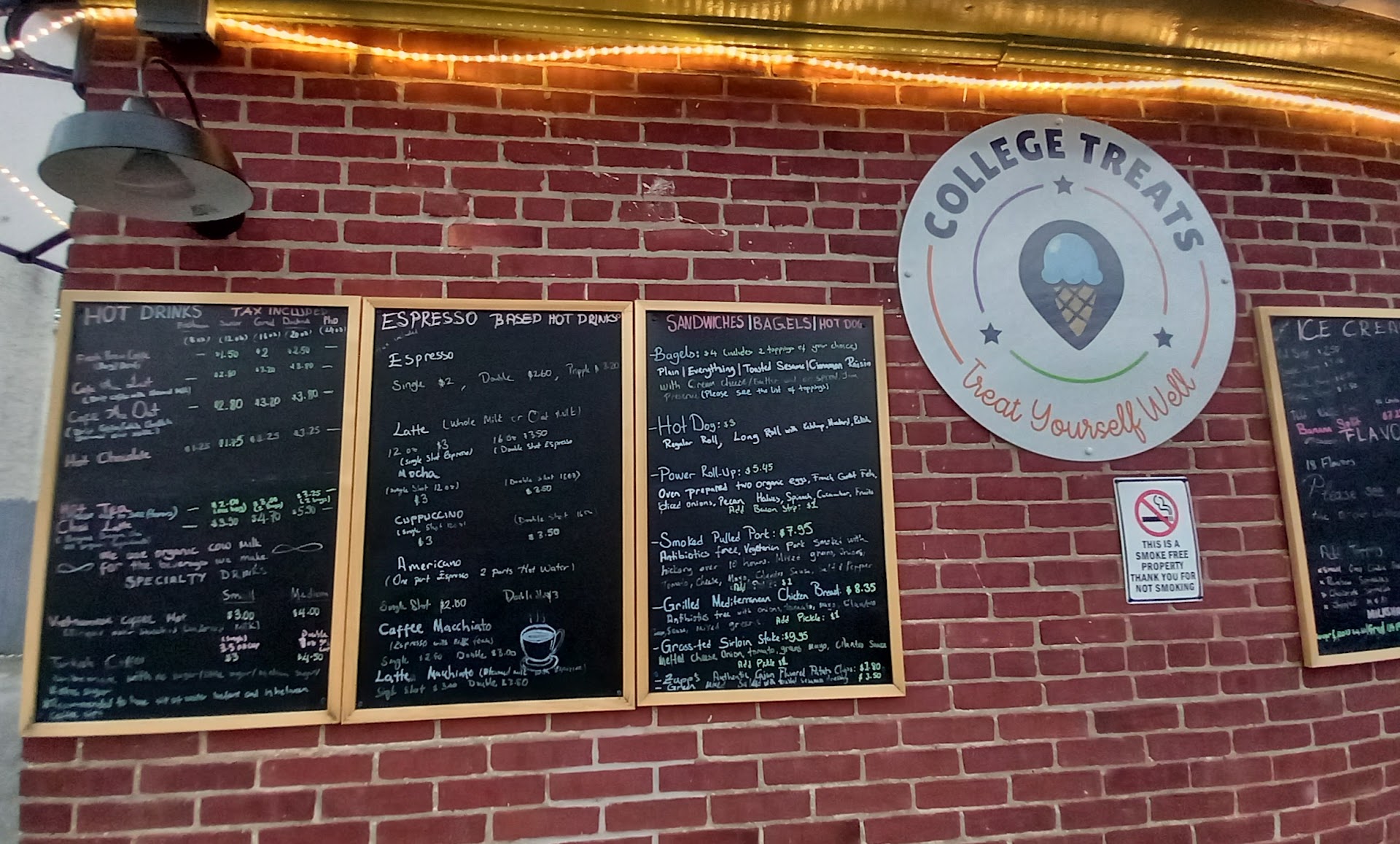 Read moreI stopped by College Treats for the first time tonight (Tuesday 4-9-24) - I'll be a frequent guest! Sign says 7 days a week 7:30am - 10pm. Prices are SO reasonable. I got a delicious & generous single scoop in a very fresh waffle cone for only $3.50! Walk up window only - very cute outdoor seating areas. Hope you can enlarge the photos to read details. (The man in photo is the, delightful, owner & gave photo permission.) Located on corner of College & Marietta - orange & purple trim on building. BTW, they do have a small...