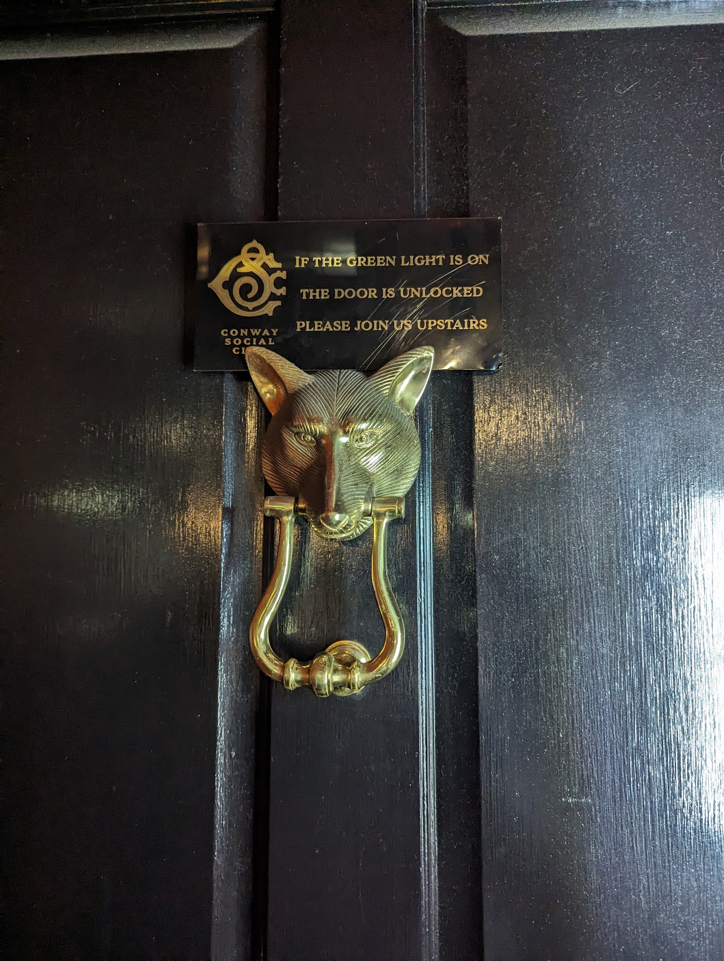 The social club is not clearly marked so of you are looking at the main red door's for Annie Bailey, look to your right slightly and you will see a black door with a brass knocker that you must use to get access to the club. A menu is posted to the right of the door.