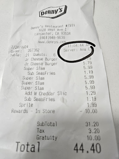 Read moreVery bad experience. We went to Denny’s last Sunday. We got a table that was facing the sun no problem. Then one of the people from the other table asked if they could turn on the misters. Our food and table got soaked. We kept asking them if they could turn them off and they said no because that one Customer requested them to be on. Our waiter never came back to check if we needed anything else. Once we wanted to pay they said you can’t go inside you have to pay outside. They took about 10 minutes to get us our check. So we had to go inside and pay. I told the manager about the misters and waiter and she told me that they couldn’t turn them off because another person had asked for them to be on, and she just said she was sorry our waiter never came back. She gave sus attitude and then Jasmine one of the other waitresses decided to argue with us. They are very rude and unprofessional. When we asked them about the other waiters from before the manager said well they got fired. All the waitresses were just sitting at the counter talking to each other and using their phones. I think they need a better staff and they should take in consideration all their customers...