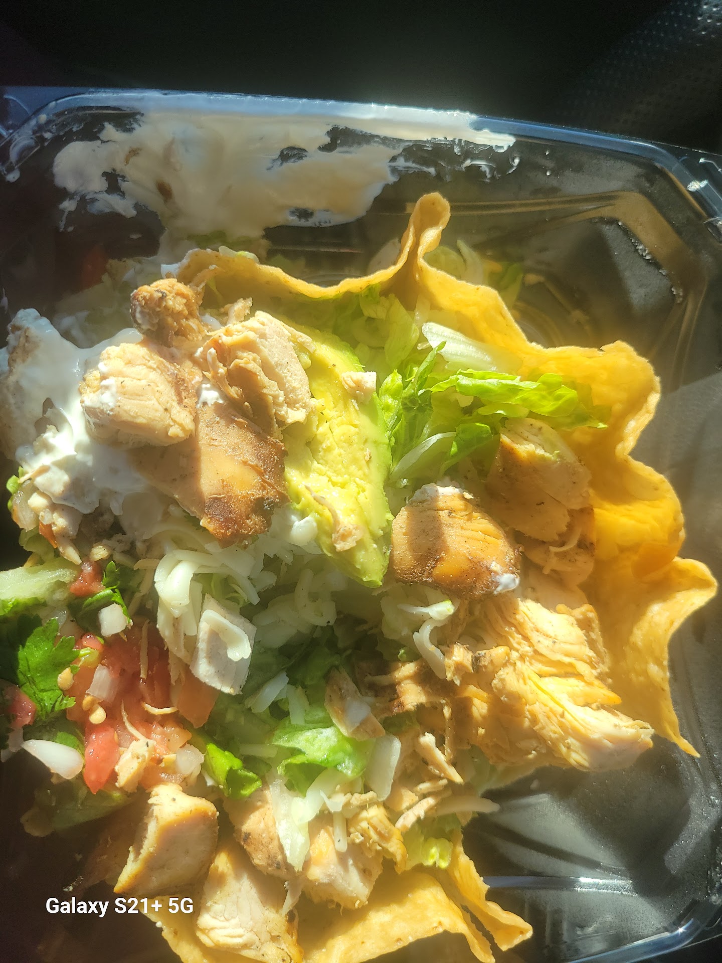 I get handed my double chicken bowl, which was not double chicken, side ways. So the sour cream and stuff just falls into the walls of the container. Fine it's an awkward bowl I get it. Nor did I get the dressing. No biggie, accidents happen.
