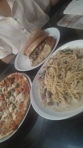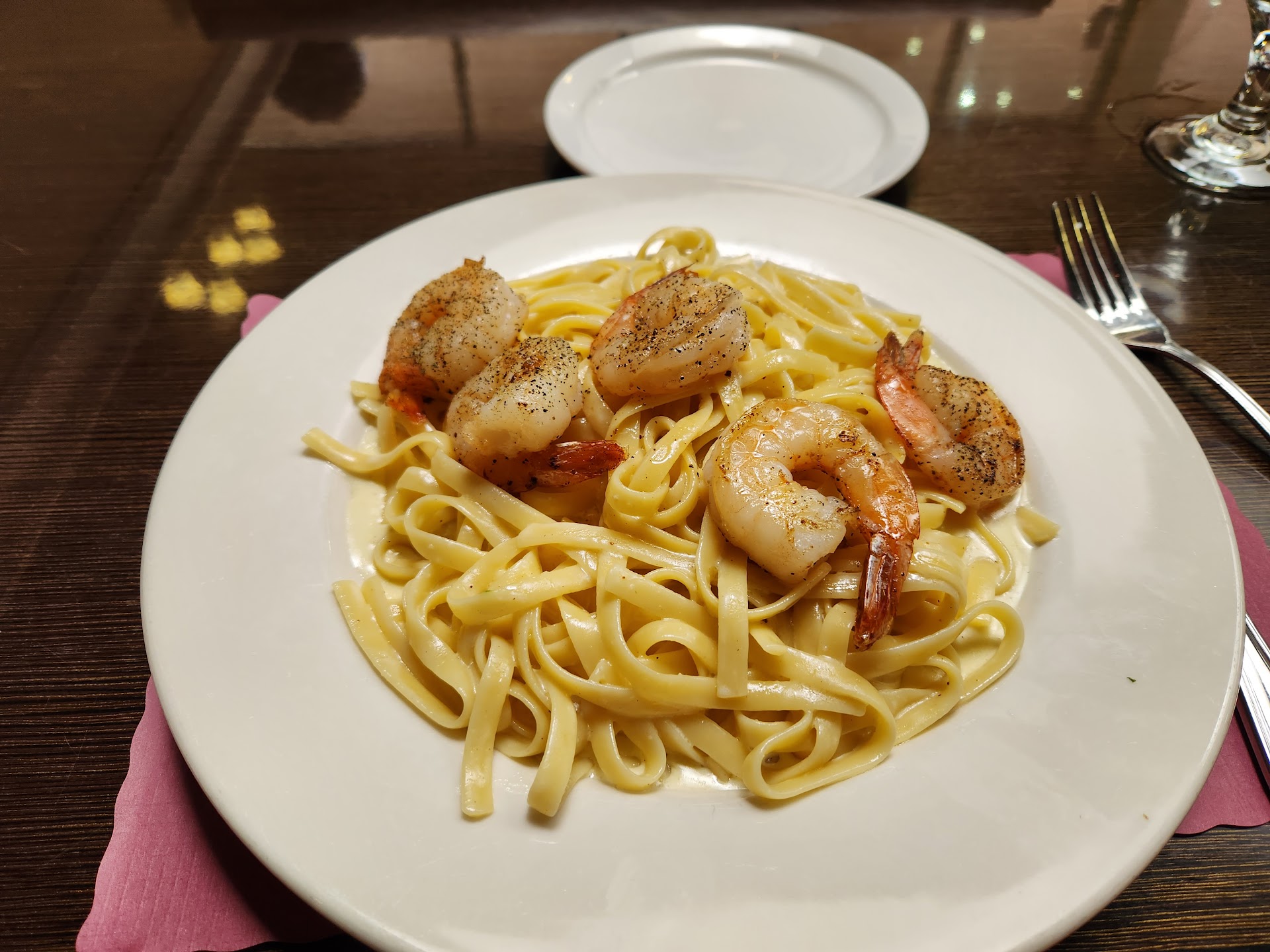 The food was not bad. Would not order pizza again. It was unremarkable and very sauce heavy for our liking. The pasta portions were large. Almost enough to split - but it's JUST pasta. No appetizers, no soup, no salad. So if you split you'll need to order a little something more. The lasagna left much to be desired. Bland and again, lots of red sauce. The layers were very striated like it hadn't had time to sit and come together. The carbonara was ok, but the sauce was thick, nearly an alfredo. The spicy tiger shrimp sauce was spicier than anticipated, but the few frozen shrimp were left on the plate.