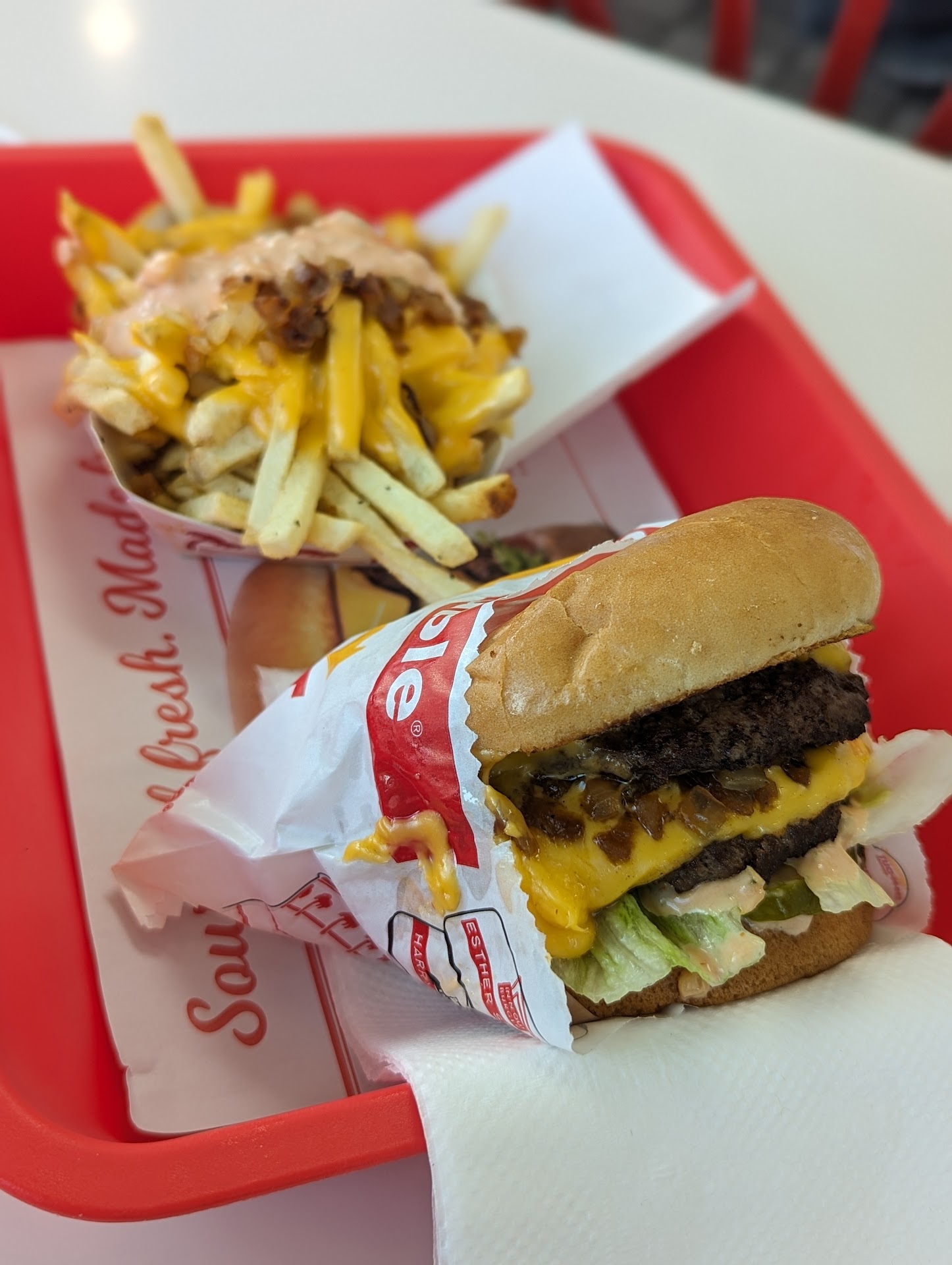 Read moreSo my boyfriend brought me to his hometown from the East coast to meet his family and he raved about In n Out and how it was his number one spot growing up. Everything was fresh and made to order....animal style....yadda yadda. So we came in for lunch, the place was being run like a well oiled machine with friendly attitudes and smiling faces. The place was busy which is always a really good sign for any food establishment. Well I ordered the hamburger combo and he did the double cheese combo animal style. After about 12 minutes our number was called, he went to grab our lunch from the counter as I waited with anticipation to try the famous In n Out burger. Took one bite and the bun was hard, I lifted the bun and saw that it was burnt. I then tried a f.f. and they were cold. I went up and handed over my burnt cold food for a freshly made box. When I received my new fresh made box, the burger was dry and flavorless. and after eating a few F.F. they tasted like white potato which are also tasteless. I ate about half of my burger and fries and tossed it in the garbage. My boyfriend stated that his meal wasn't what he recalled it being either. He said the quality was really low and that the burger didn't seemed to be hand pattie like they once were. So needless to say, i wasn't impressed and my boyfriend was disappointed. He said his child hood...