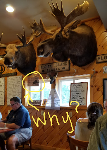 The decor: Oh, where to begin. I suppose I could start with the signed poster of a young beauty pageant winner, or perhaps the plaque reading "There are two theories to arguin' with a woman. Neither one works." Every inch of their walls are adorned with taxidermied black bears, moose, mountain lions, and pictures of the owners posing with the just-killed animals. There's general game hunting, then there's trophy hunting. Not one grizzly bear, but two.