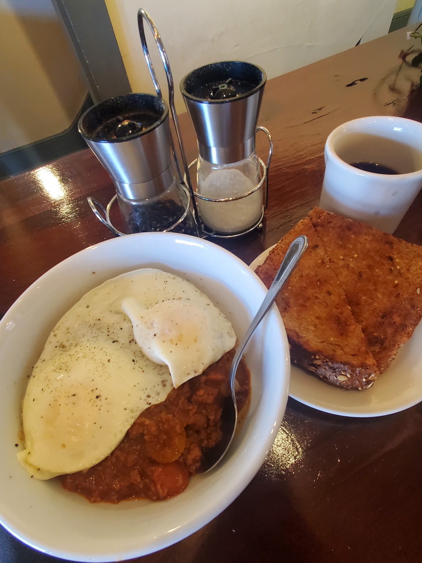 Read moreI got the steam table special and that was some kind of chili over rice and 2 eggs any style you like on top. It had green olives in it so it must be some cuban inspired dish. I ordered before coffee, so I am sure this was explained but my mind switches on during the first cup and itsn full engaged until the 2nd us three quarters down the hatch. I elected the 7 grain toast, I am glad I did, it was hearty dense and rich in falvors and texture. Thick cut and amply buttered it was a delight to have. They have some pretty cool artwork hanging on the walls, I won't take pictures of all them, you should go see them for yourself. They have some kind of mug club program involving discounts on coffee, or likely do based on the mugs with names on them hanging on the wall. They also still have an old school rewards program with cards and all... kinda cool throwback, I neglected to pick one up of course. I was wondering, based on their small space how they could possibly do enough business to stay open... then I went downtown and they have a bunch more people crammed into 2 rooms down there. The bathrooms were infinitesimal, but clean and well cared for. All in all a...