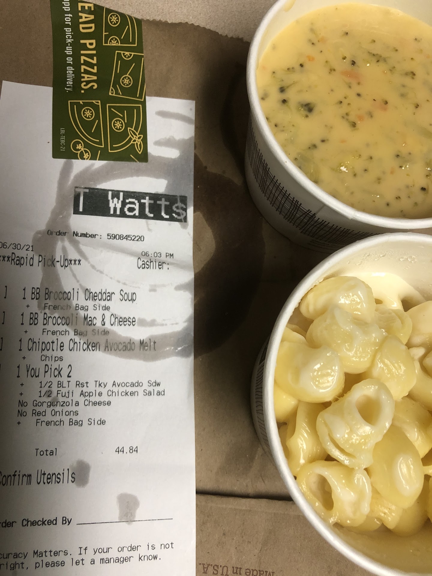 Whe we got the order the 1/2 Mac and cheese, was ordered my my mother-in-law also had my son's 1/2 steak and white cheddar sandwich. And my 1/2 ceasar salad didn't have the chicken that I ordered.