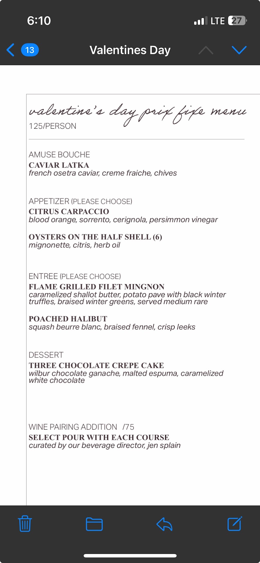 The desserts were creative, delicious, and normally priced for this caliber restaurant. The Panna Cotta was the only dish of the evening I wished was larger. I'm laughing as I type that but serious.