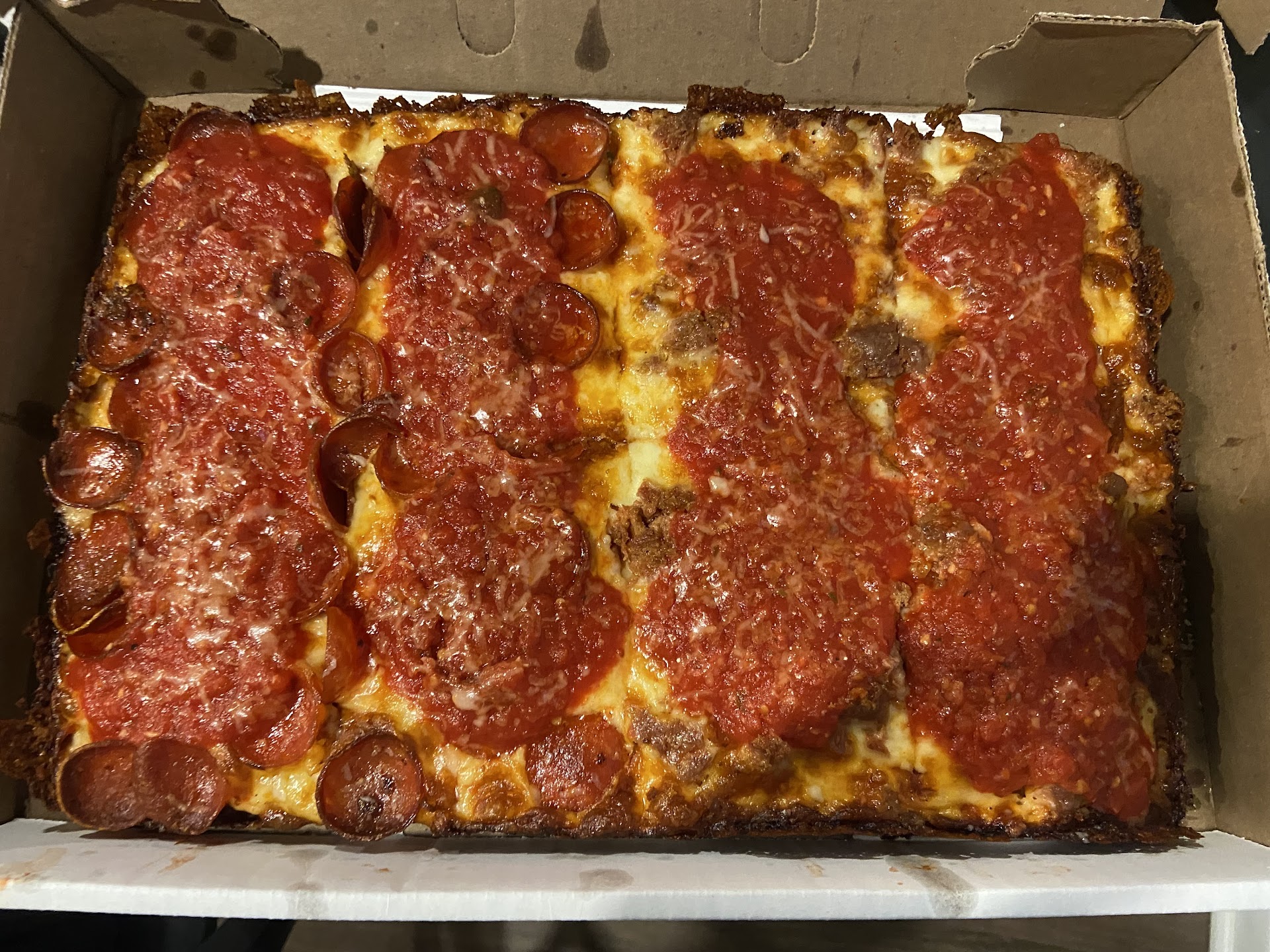 One of the deep dish detroit pizzas was burnt on the bottom, the crust was more like webbed bread than pizza dough. The hand tossed pizza dough was very salty, with low grade cheese, and inedible. The pizza dough was not fresh at all, you could tell it was frozen.