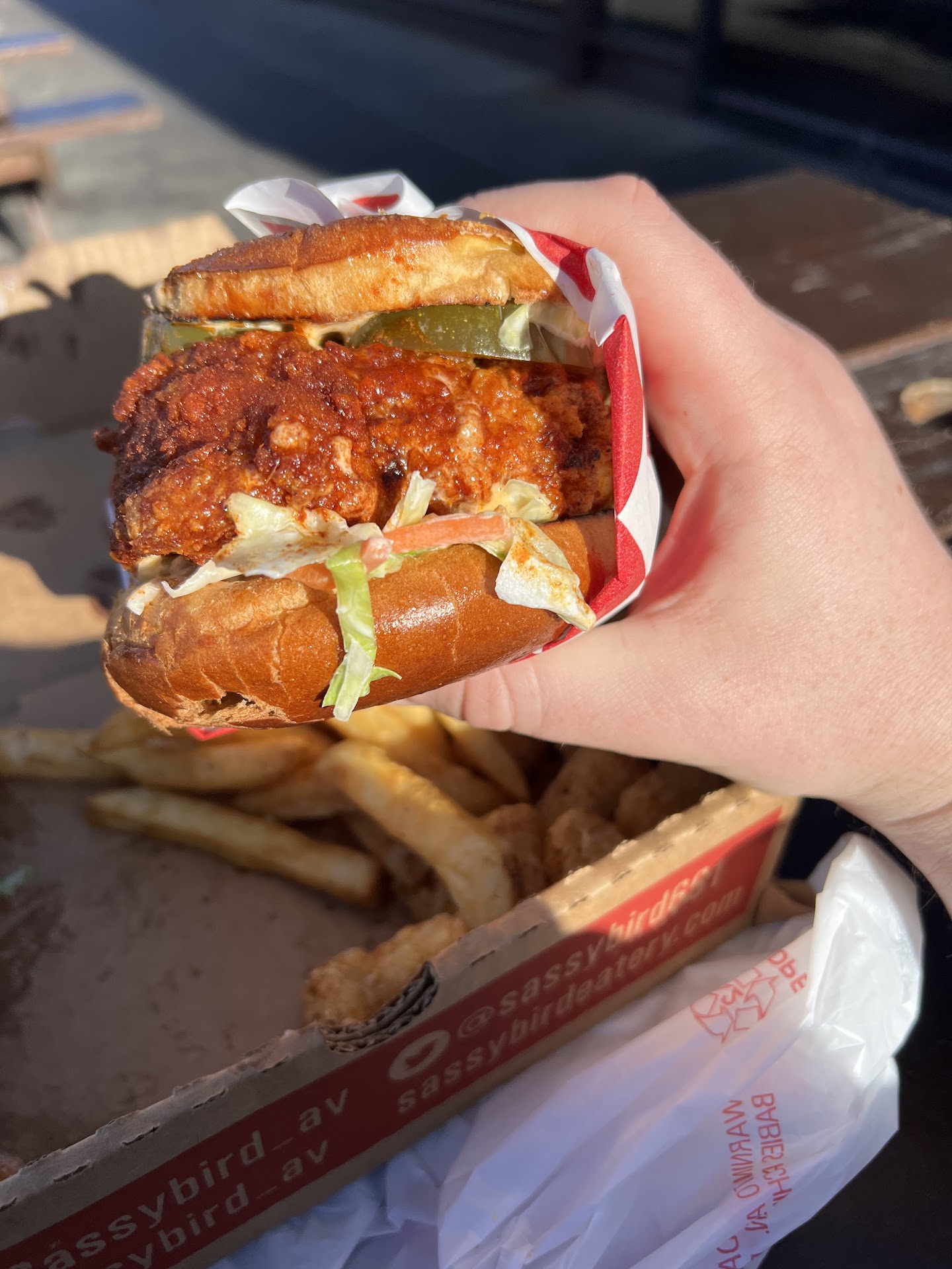 Ā Ā Ā Read moreSassy bird is a Nashville fried chicken restaurant. In case you donāt know what Nashville hot chicken is itās fried chicken with spicy oil for flavor. Sassy bird gets six different types of hot flavor and all of them are amazing. The first time I went here I got the sassy Mack ball. this is a bowl filled with mac & cheese, chicken of your flavor, pickles, coleslaw, and a choice of either fries or tater tots. I personally love tater tots and get them every chance I get, and I think you made a huge difference getting tater tots with his bowl. This bowl was everything I wanted all combined together. Itās packed with flavor and very very filling. Be prepared to want to take a nap after eating his bowl but well worth it. The second time I went there I got the loaded fries. Once again, you can get it loaded fries with your choice of french fries or tater tots or both. So I got the loaded half-and-half, which comes with have fries have tater tots, their sassy sauce, pickles, and coleslaw. I put pictures and the box was literally busting out with these fries. The first bite was phenomenal and I did close my eyes to enjoy it. I highly recommend one of these two dishes for the first time going. Itās a great introduction, but feel free to try everything on the menu because everything is amazing. I will be coming back to this place and I will be trying everything...