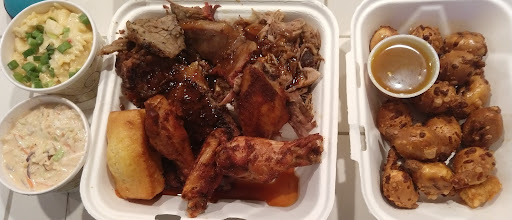 First time going here, I got the Smokin' T's original platter and an order of cheese stuffed pretzel bites which were on today's special menu. Can't speak for the dine-in experience since I got takeout, so I'll focus on the food. The pretzel bites were supposed to come with a sriracha honey mustard dipping sauce. They were out of the sauce, so they came with maple mustard sauce instead, which was still very good. A couple of the bites seemed to have lost some of their cheese in the cooking process, but they were overall quite tasty and a pretty generous portion. The platter states that it comes with 1/3 rack of ribs, 1/4 lb brisket, 1/4 lb pulled pork, a smoked chicken thigh, pepper jack mac & cheese, and apple coleslaw. There was also cornbread. Again, they were out of the smoked chicken thigh, which they substituted with smoked chicken wings (2 flats and 2 drums). First of all, the portions were huge. I don't believe there was only 1/4 lb each of brisket and pork. My husband and I actually each got a platter and agreed after that we easily could just have split one. I'll start with my least favorite item, the mac & cheese. It wasn't bad, per se, just a little flat for me. There were scallions on top that added some interest, but it wasn't something I'd eat alone. It did pair nicely with the meats though. The coleslaw was very tasty, although there was an excessive amount of dressing. This is not really a negative for me, since using a fork eliminates the excess, and it wasn't watery or anything, but it did look soupy. The chicken wings were delicious, juicy and flavorful in a way that reminds me of a Chinese food chicken wing, but better. The brisket was tender and delicious. The pulled pork was tender and delicious. The ribs were the most tender, flavorful, mouthwateringly amazing ribs I have ever had. I actually don't even usually bother with ribs because I don't like food that's work, but the meat fell right off the bones and was just so good. I didn't have room for my cornbread but my husband said his was good. Overall, the food here was stellar and I highly...