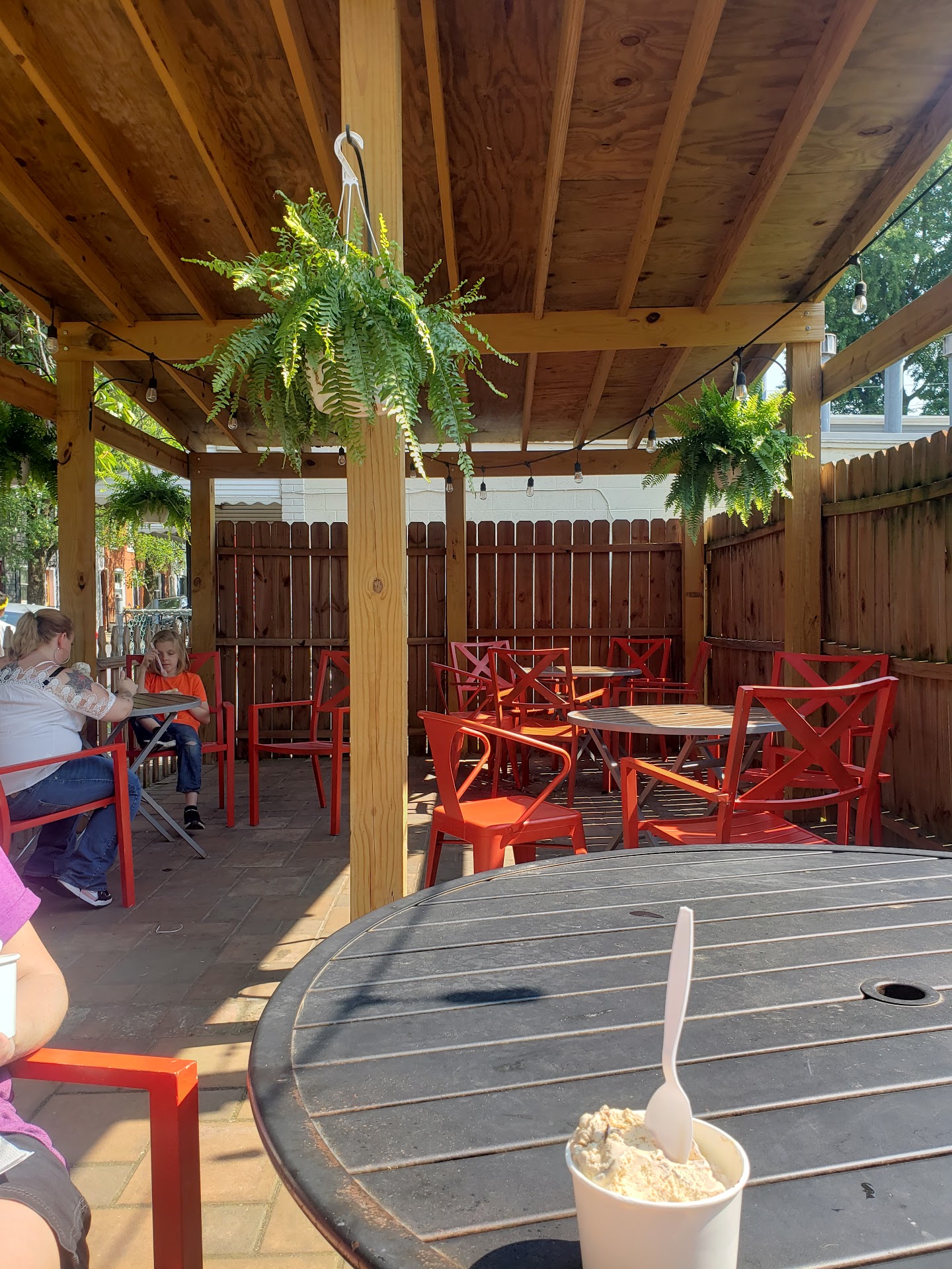 A fantastic spread of flavors and toppings served up simply, cup or a cone. I opted for 2 scoops and 2 toppings and it ended up being 2 much for me to finish (that's probably a good problem to have btw). That being said, the scoops are hefty, hefty. I tried this place out with a friend, and it was empty on a Monday around 6:30, so no wait for service of course. When I'm left to 'build' my own order, I always like asking staff what they like the most, or new and featured items, or simply any type of feedback on the order. I was on my own here as the young girl behind the counter, while friendly and attentive, was probably more interested in enjoying her summer evenings instead of deciphering my sweet tooth at the end of her day 🤣. TL;DR -- Great location in a cozy corner cafe with comfy outdoor, shaded seating. Fantastic ice cream and more priced better than competitors in the area. Will be back to try other menu items and of course...