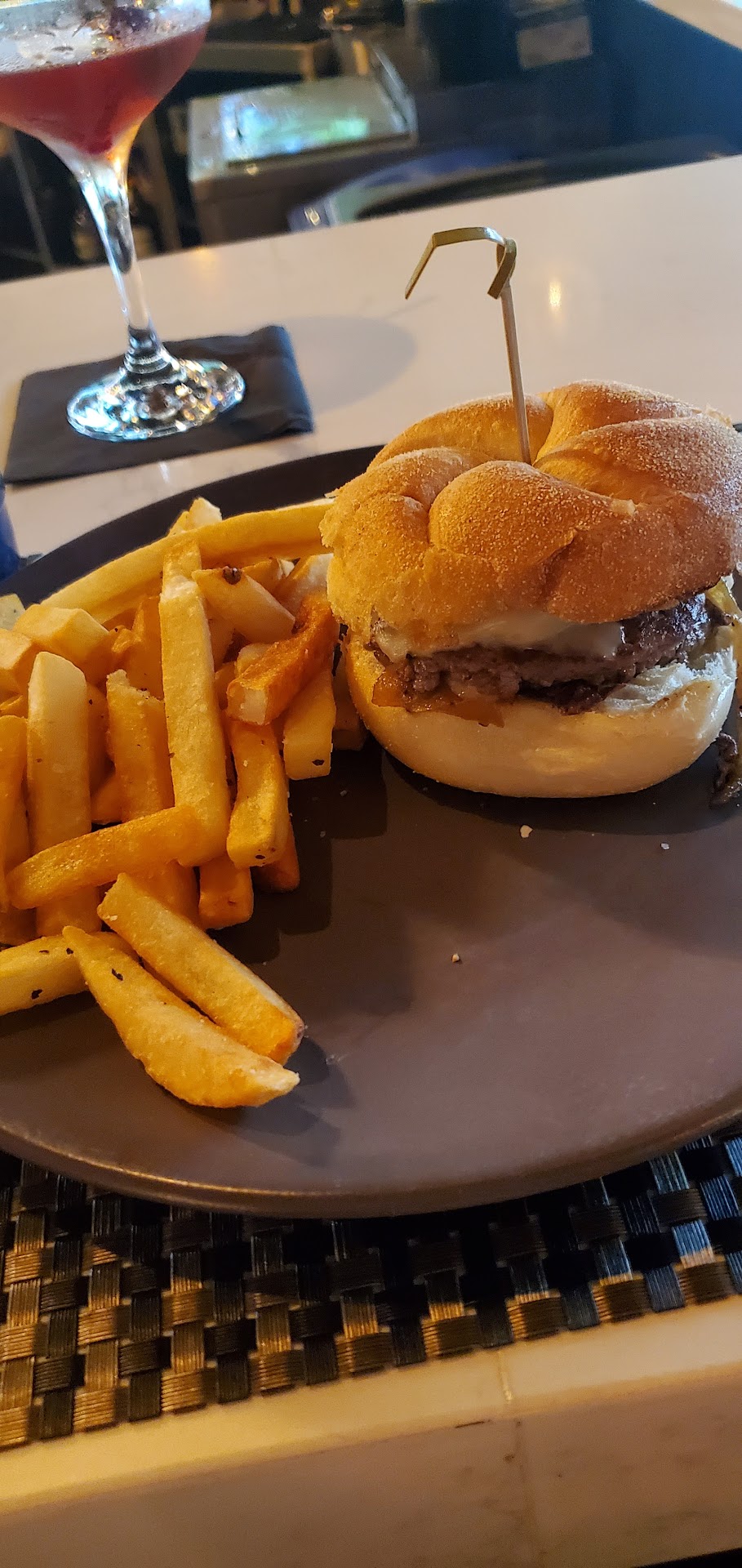 Enter the hand helds. I went with smash burger, herb fries and a side of mayo. M went with the chicken sandwich with same. Her sandwich was tasty, and large. The smash burgers, not so much. She did comment that she'd seen larger patties at McDonald's. The sandwich overall was small, and not as much flavor as other pub smash burgers that I've had locally. I definitely expected more from the same menu that featured things like pork and filets for nearly $40 per plate. The herb fries were little more than what tasted like frozen fries with a little coarse salt on them. And the mayo was forgotten so I waited while the runner went all over creation to find it. Bless him.