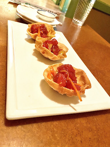 Spice Tuna Tacos- these were great appetizers! Light & fresh tasting (a lot of sushi restaurants in tampa, I find, don’t have very fresh tasting fish). The shells were thick and crispy (maybe too thick?) and the sauce it was covered in was lightly salted (probably soy) sweetened with some sugar! Only issue I have with it is that I really didn’t taste or see any or very little cucumber. That would have made this very refreshing. 4/5
