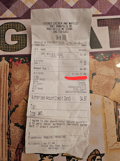 Read moreGood afternoon everyone I want to share this experience that happened today August 7 2025 unfortunately I went by an establishment called Legends fried Chicken which is located at 6401 Annapolis Rd Hyattsville Maryland and I bought 15 pieces of chicken I was very happy I have always bought at that place but this time when I got home to enjoy the piece of chicken when I picked it up and smelled it it had an unpleasant smell and I removed the skin and it was a little dark and I returned to the establishment and two young men attended to me who I don't think was the manager but he told me that he was in charge well I told him that the chicken was bad and that I wanted my money back he said no the chicken is good I can't but I mentioned that I was going to call someone to see what we could do because if you call the food department that place could be canceled because the chicken looked very bad after so much he decided to return my money although he didn't return my entire expense was $ 34.97 and they only returned me $ 24.97 yes They asked for a rating, I think this score will give you half of one because they are not serving well. I have been there before and the chicken was good, but today it was a bad experience, I will not go to that establishment again