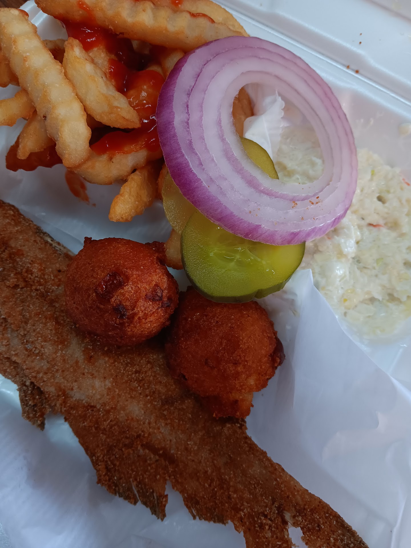 Read moreOh my goodness! I’m a diehard food critic and rarely find a restaurant that I like everything I order however this was a different experience because everything was seasoned, fresh and piping hot! The whole catfish was fried to perfection, the hush puppies were amazing, the coleslaw was delicious and the fries were even good. Fried green tomatoes and the homemade sauce, fried okra, hot wings, fried shrimp and chicken tenders were all AMAZING. You literally can not go wrong with anything you order and the owner is a very sweet and pleasant woman. Thanks for an amazing experience!