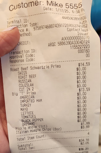 Read moreWe live right around the corner from this location and unfortunately, we always receive incorrect orders. My wife is vegetarian and has ordered cheese hoagies that have arrived with ham on them (the whole sandwich, not just a small piece) and I've ordered items from their "premade" menu and gotten toppings that were not mentioned or ordered. On top of this, since this location closes earlier than others (6pm on the days we have ordered) we usually don't have a chance to have the mistakes corrected.