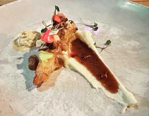 Dish #2 consisted of sous vide pork rubbed with black garlic. The pork was super tender with great mouthfeel. But what really surprised me was the parsnips with marcona almond āpateāā. One of the things that make me think I am in the hands of a very talented chef is when food I know (think?) I donāt like is transformed into something I truly enjoy. This happened three times in this meal. The mushrooms in course #1, the parsnips here ā they were tender and perfectly paired with some type of marcona almond pateā & vinaigrette, and the beets in course #4 below. I was really surprised. And happy.