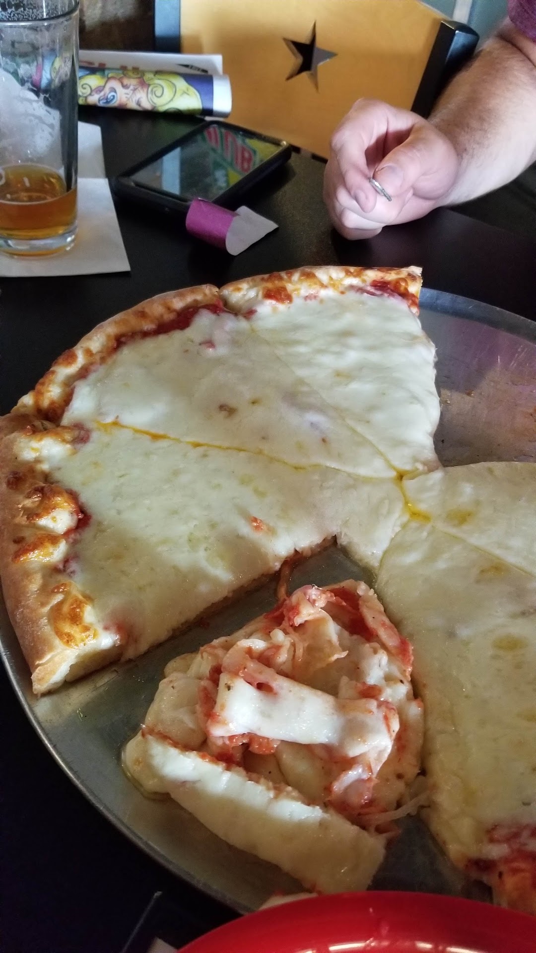 The primary issue was the unbelievably excessive amount of cheese on the pizza. I ate a slice and 3/4 and went home sick to my stomach. So did my wife. Don't even look at this place's pizzas if you are lactose intolerant, you will probably burst into flame on the spot. I think I will probably go back, but I am definitely going to ask for half cheese. By which I mean lighten up on the cheese, not cheese on one half but not the other. To be brutally honest, they should change their recipe in my opinion. It's not fit for human consumption without modifying.