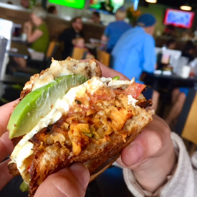 I ordered the Cabo Hash ("chorizo, redskin potato, sweet potato, pickled red onion, queso fresco & cheddar and sunnyside up eggs topped with pico de gallo & lime crema"). My fiancee ordered the Marley Nachos ("smoked chicken, jerk sauce, pineapple, pepper jack & cheddar cheese, habanero relish, cilantro & romaine").