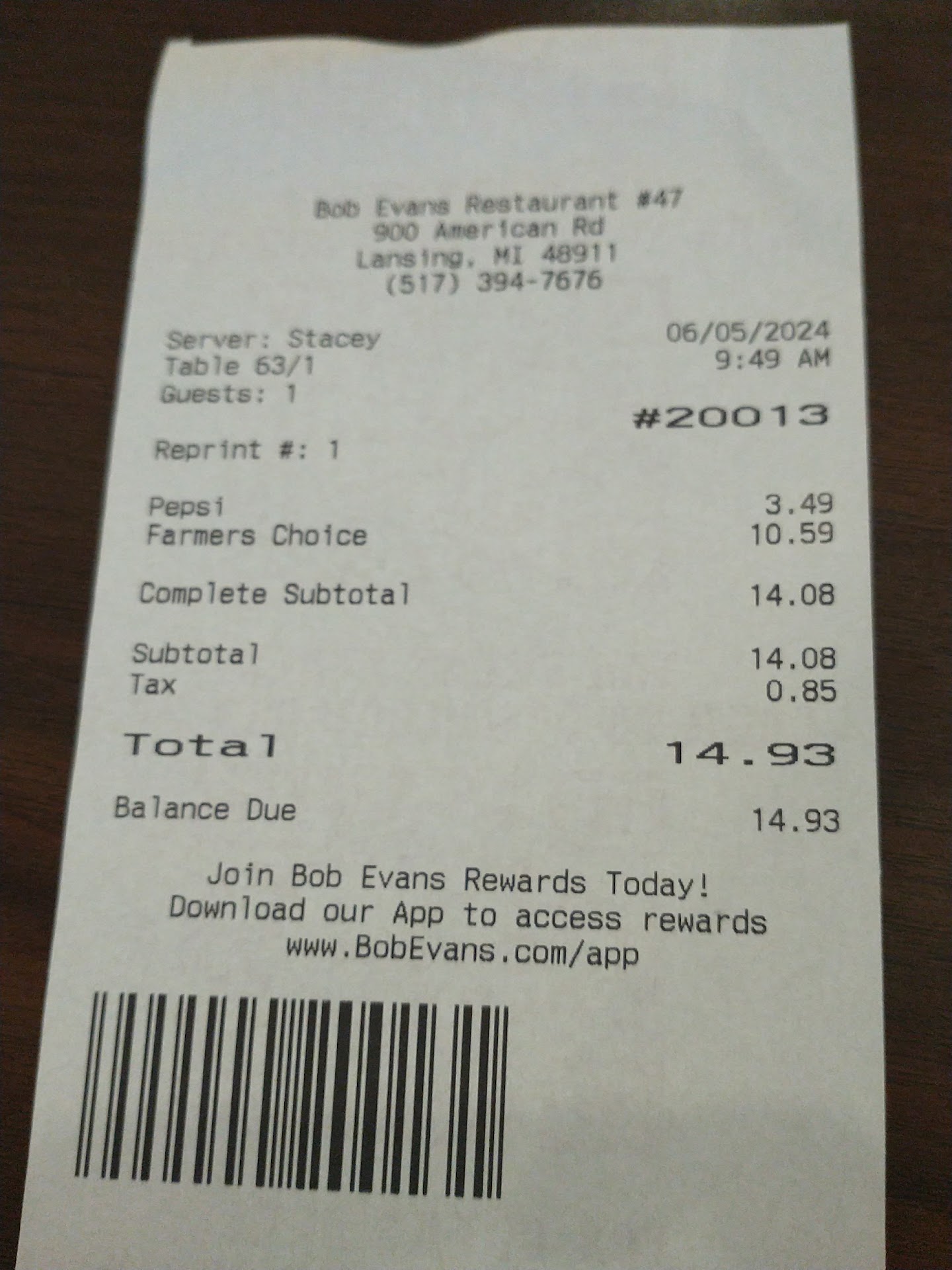 After 10 minutes of struggling to get down our meals, we were just done. Another 15 min without our waitress checking on us I went to the counter to get our check.