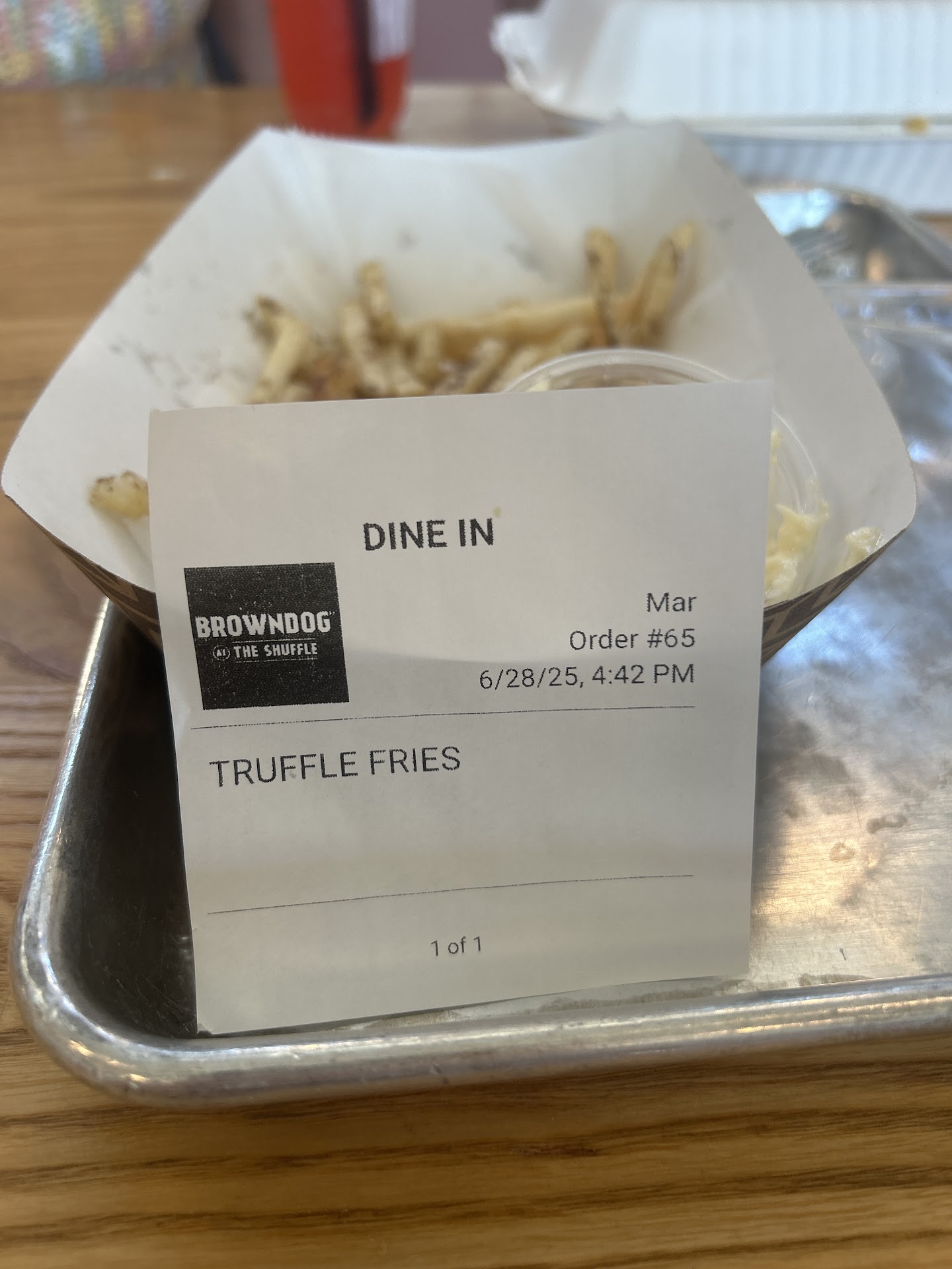 Read moreThe shuffle in itself is a pretty interesting place with several restaurants around the boundary and a full-service bar as well. It would not be wrong to think of it as an upscale food court but also that would be completely and inadequate description. Brown dog at the shuffle had such a great selection that most of our group ended up with something from there. Our large group ended up being a confusing set of orders with more than one change and backtracking along the way, the person working with us had amazing patience and an excellent attitude throughout. There was excellent ice cream, with a subset of boozy shakes available, to double-decker burgers/impossible burgers and a variety of different delightful fries. They had several other selections, from Rubens to Nashville hot chicken so we will have to be going back several times to try all of those. Can absolutely recommend them to most anyone interested...