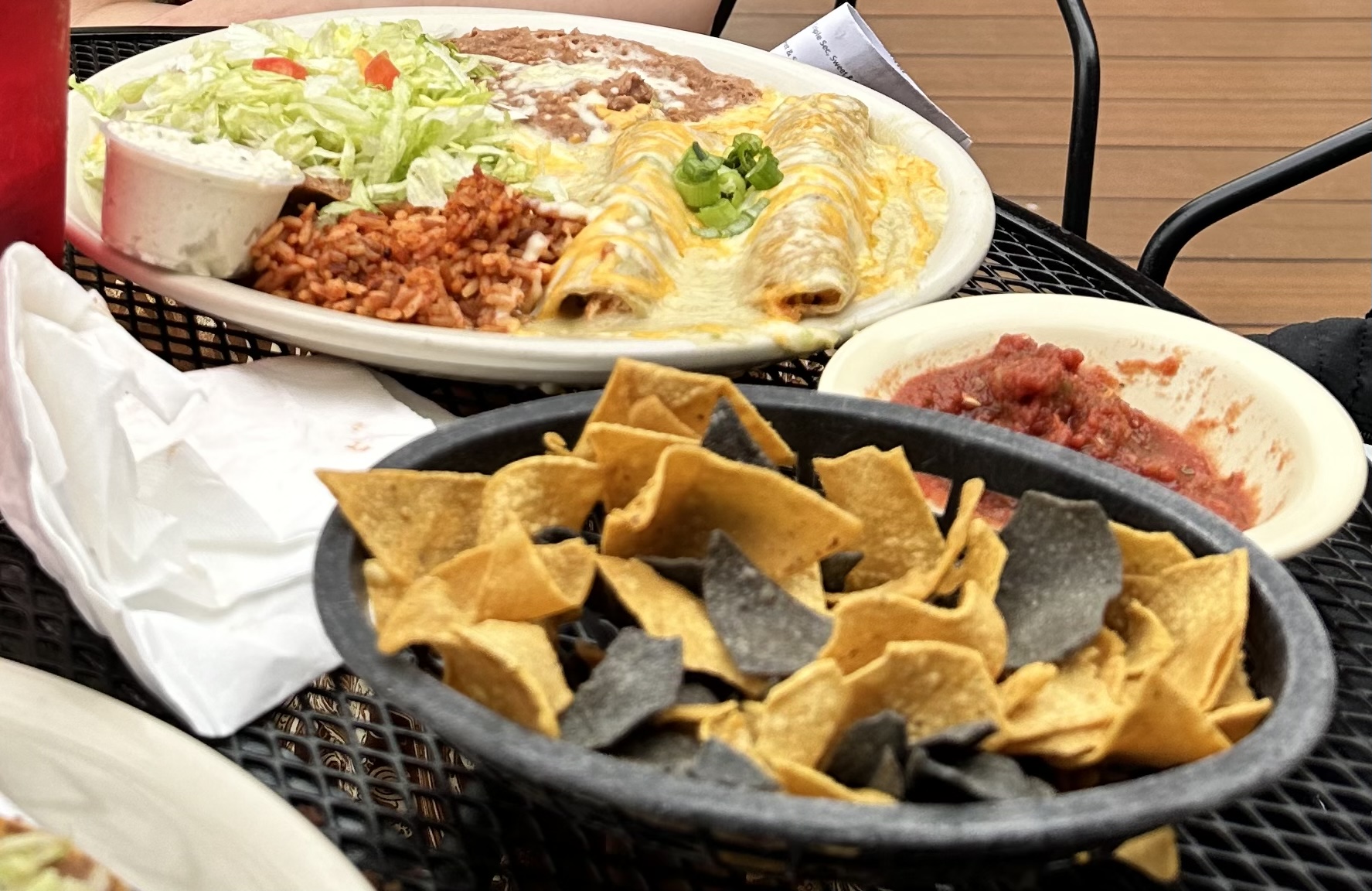 I ordered the chicken flauta plate and my daughter ordered a la carte items: 2 beef tacos, a quesadilla, and a chicken gordita. While we waited we were given some chips and salsa--and the cheese dip appetizer we also ordered. Their salsa isn't very good. It's thick and tastes like it came from a can. It has a little spice to it but not much. Their cheese dip is not like other cheese dip, and that, thankfully, is still as good as always (they use various cheeses, including cottage cheese, green onions, and a special secret seasoning. It is chunky, not melted). Sadly, the chips are very hard and not very tasty.