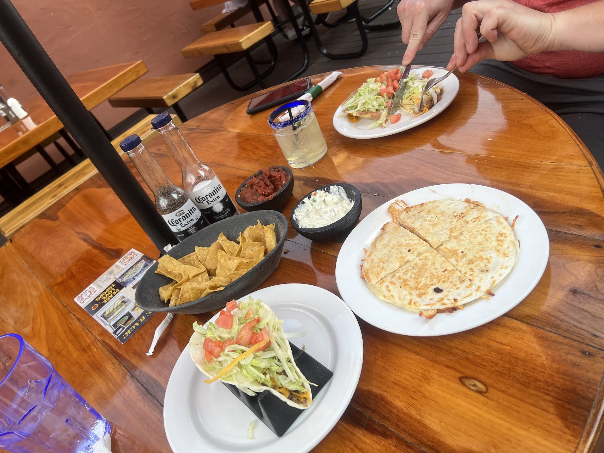 My daughter's quesadilla was gross. It was soggy, greasy, and horrible. She couldn't get past a few bites. Her tacos came with dry ground meat (seasoning was so-so) and lots and lots of lettuce. No cheese. No sauce, No onions, no cilantro, no lime. Nothing. I almost had to laugh because they call themselves "authentic." I ended up taking one of the tacos and giving her a flauta. After pulling out all the lettuce there was about 1/4 cup of filling inside the big soft shell. I put the guacamole and some salsa on the taco to make it a bit more palatable. The gordita was the favorite on her plate.