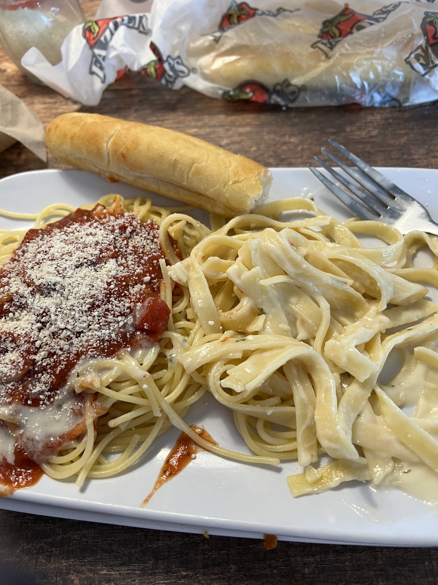 My wife loves to order the pagetti with marinara sauce and noodles with Alfredo sauce with this sauce is on the side. I love to order two spaghettiās with meatballs, which comes with Pat and they are delicious breadsticks.
