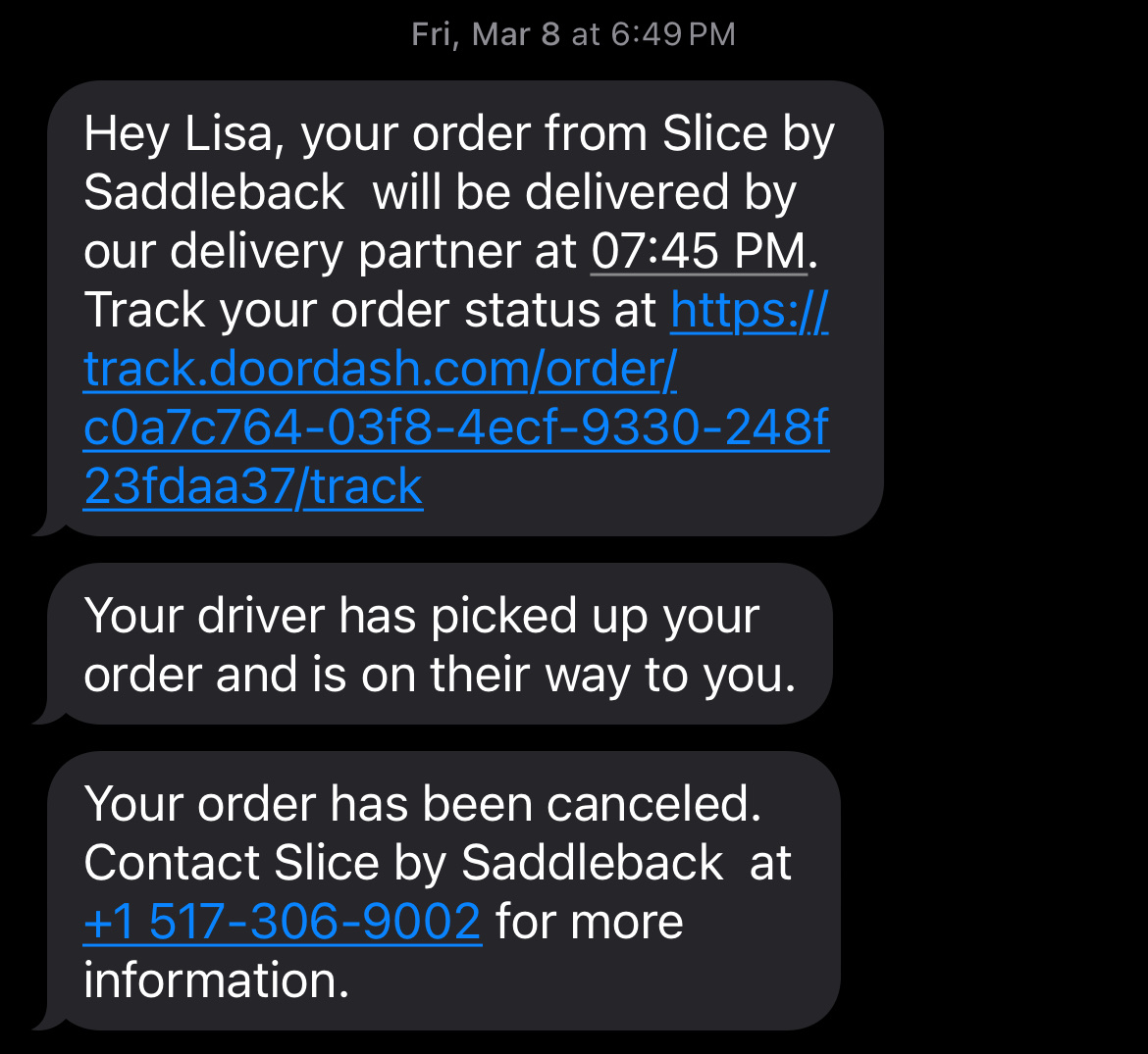 We had pick up orders two other times over the last year or so and loved the food! We decided on delivery this time since we were not feeling well. Placed order online 6:49 via the Slice website and waited patiently for it to arrive. Got text at 7:45 letting us know the driver was on their way (we live 5min from there) and then 7:57 it was CANCELLED??!! I immediately called Slice and no one answered that location (they close at 8pm) and I left a message asking for a call back. We received nothing and CC still charge for order + delivery. Next day no one returned my call so I called and spoke with the manager. She took ZERO responsibility for the situation and would not refund my credit card, saying it was not their fault but instead I would need to contact DoorDash as they do their delivering and apparently the driver stole our order and money. It sounded like she was not surprised this happened at all. She was rude and had no customer service skills at all. I was irate. Called DoorDash (she would not give me their phone number so I googled it) and was told that I would have to work with the business as DoorDash cannot provide a refund. I didnât even know I was doing business with DoorDash! I called Slice back and she ended up crediting our Slice account (NOT credit card) toward a future food order. I asked her why they would hire DoorDash if they steal from their customers and she told me itâs because they donât have enough staff to do deliveries and the deliveries bring them a lot of business. WOW.