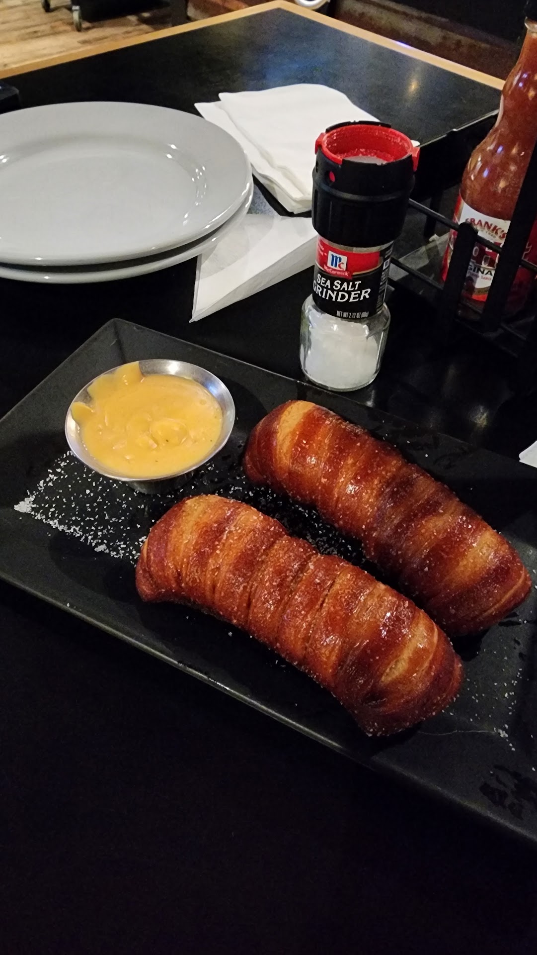 We ordered the "large" Bavarian pretzels for an appetizer. It came with two, 5"-6" small pretzels. They were tasty but a horrible appetizer for sharing due to their extremely small size. The cheese sauce tasted okay but was lumpy.