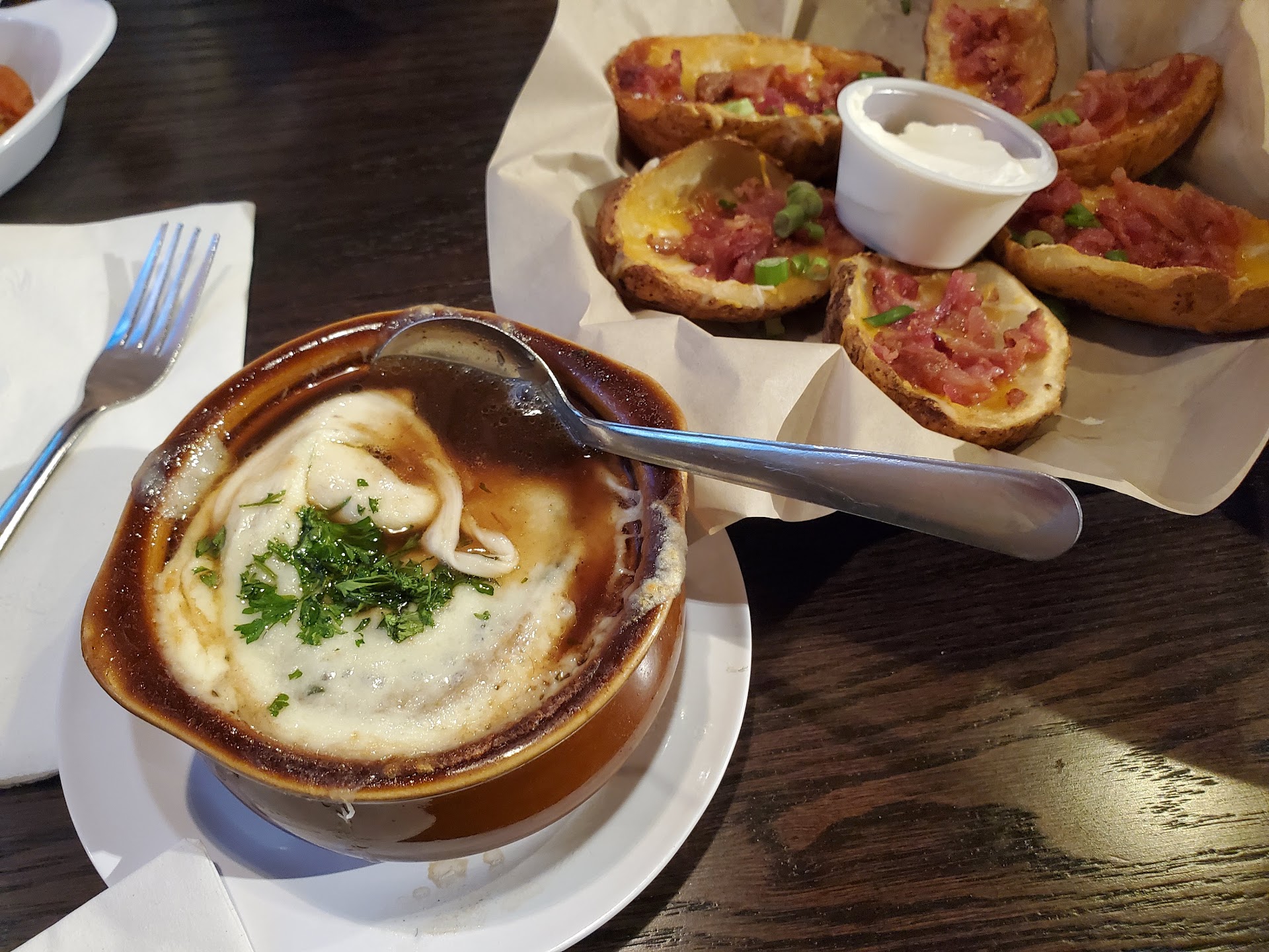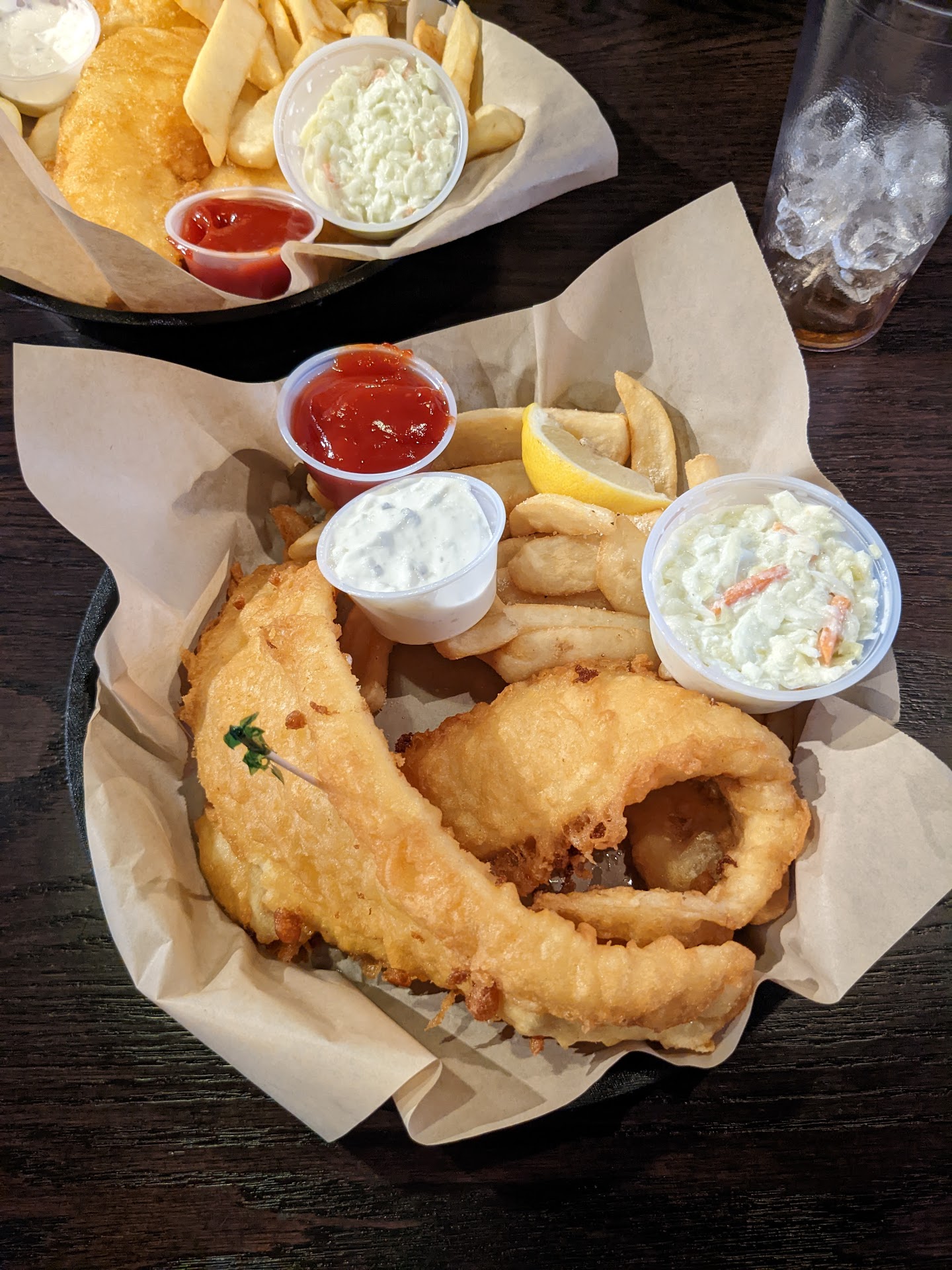 Read moreThis place can get pretty busy on weekend evenings, but we stopped in for lunch on a Sunday and were seated right away. Our server was very friendly and fun. In addition to multiple big TVs above the bar, there are several nice, spacious booths with private TVs, so this would be a great place to come watch a game with friends. I loved the fish & chips - the fish was flaky and tender, and the tartar sauce was really tangy. Definitely recommend getting with the steak fries, which were perfect for fish & chips. Also got a bowl of their clam chowder, which was delicious and hearty. Another person got the French onion soup, which was better than most other places I've gotten it in Lansing. It was flavorful and savory without being too salty or heavy. We also got the wings, which were nice and crispy, and not drowning in sauce. The fried pickles were zesty and not greasy. We ordered the potato skins, which were fine, but truthfully I probably won't order again (especially because so much of the other stuff was great). We also tried the carrot cake and pecan ball sundae for dessert (they were out of bread pudding, so we'll definitely have to try that later!) The pecan ball sundae was a scoop of ice cream rolled in chopped pecans, with a little chocolate sauce and whipped cream. It was simple, but very tasty! And the carrot cake was delicious, but i think i have a bit of an issue with it being called carrot cake - there was very little carrot in the piece we got, and it was packed with shredded coconut. It had a layer of dense cream cheese frosting about half an inch thick on top sprinkled with cinnamon and nutmeg. I thought it was great, but beware if you don't...