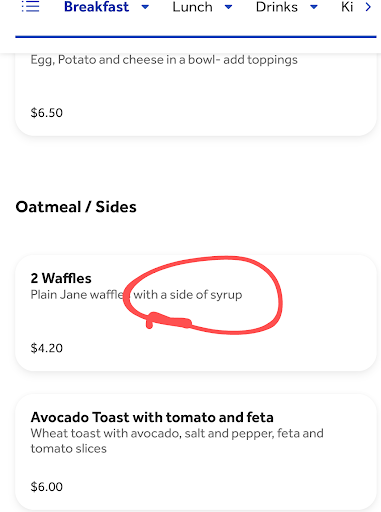 This is not the first time I've ordered from Turtle Rock, and once again, the plain waffle did not come with syrup as indicated on the online menu. This time, I also ordered instant oatmeal, but the oatmeal was missing from the order.