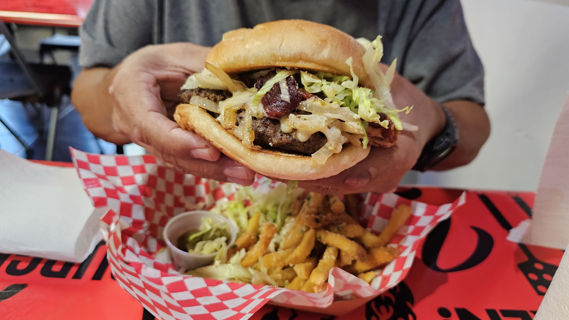 One of the best burger spots in Laredo. Fresh quality ingredients, every item is cooked at the moment so the flavor is beyond good. Since they're preparing your meal, the restaurant smells incredible. We got our order to go and everything was delicious. I got "The Fancy" burger, which comes with blue cheese and a sweet Balsamic Glaze that added a perfect balance of flavors to the burger. My partner got "The Egg & I" burger that has a sunny side up egg and fresh vegetables. All burgers are come with 8oz Angus Beef patty and include parmesan fries on the side. Moreover we got the "Botanero lime" wings, even though they were not crispy, the flavor was pretty good. I was planning to order the Birria Burger but they ran out of Birria, apparently they prepare it on Wednesday (it takes around 24hours to cook) but by Friday it is gone completely. I'm definitely coming back to try that one out as well as the...
