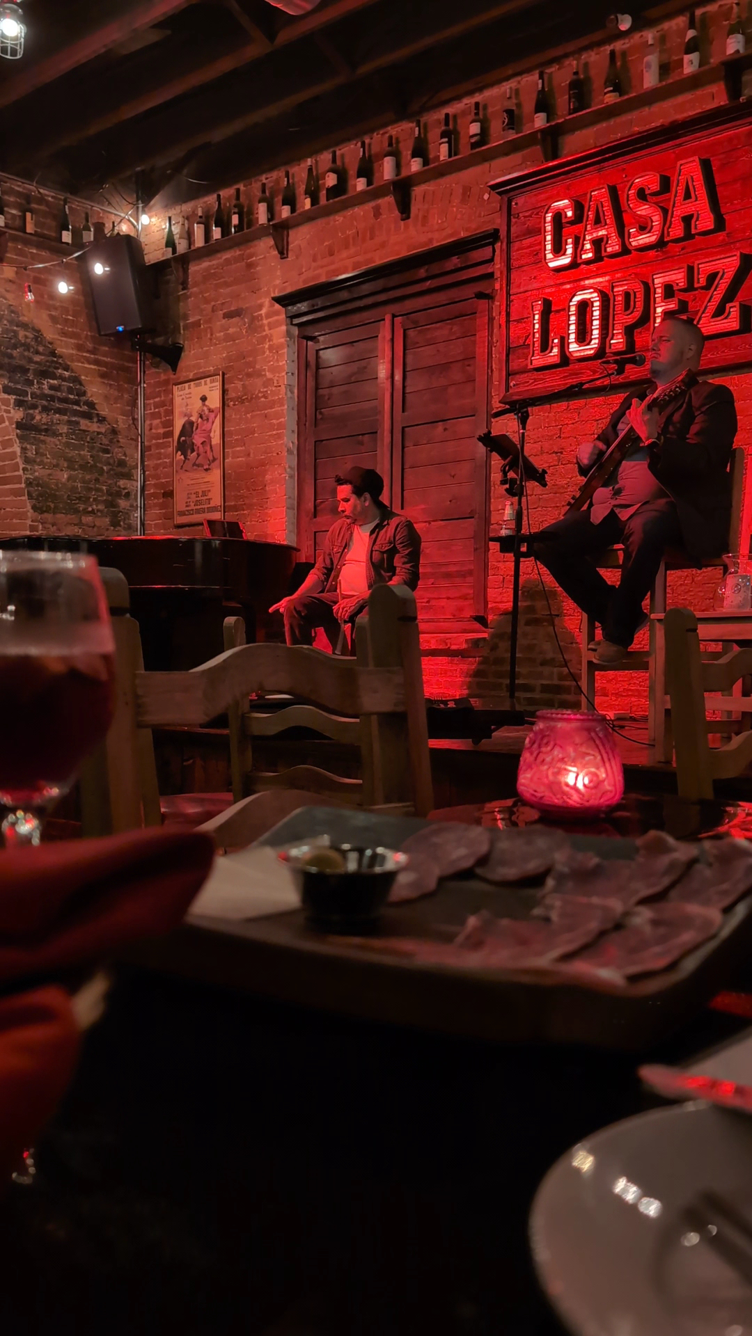 It was our first time to this establishment. I was under the impression we needed reservations, because we were turned back the last time for not making reservations. They're only open Fri, Sat, & Sun from 7pm to 12 i believe. No 1 answered the phone before to make the reservation nor did I get a call back (I left a message) ANYWAYS. We decided to just go again and see what happens. Located in a very run down part of the city, as soon as you walk in though the doors, you're in another place. You forget about the outside world. The atmosphere is the best part. I'll go as far as to say "The best in Laredo". The food was great too. The chicken and shrimp 🍤 sherry/lemon/buttery sauce is to to die for! The Lopez plate, presented in what I think is an oak barrel plate, had a nice blend of cold meats, cheese, and olives. Spicy potatoes could have been a bit spicier, but still inviting. I loved the calamari. All washed down with a pitcher of refreshing 😋 Sangria. We shared a Flan just to try it out. Not a bad way of topping dinner off. The portions were good. Just note that the flan is more of a personal size. Service wasn't as good as the food, but hey it's laredo. We ran low on our water, and took about 30mins to pick up the tab (the card was sticking out and at the edge of the table for that long) There was maybe 5 tables tops, so I don't see what excuse they would use for overseeing this. We didn't mind, again the Live music was welcoming. As we existed the doors, we were Slapped in the face with the stench of raw sewerage. It basically said "Welcome back to Laredo's downtown" I can't blame them for this. This is a city problem. The Bars on It street, the Tack room, etc they all suffer from this... So if you're looking for a romantic dinner with live entertainment, and excellent food, AND are unfortunate enough to be stuck in Laredo, I highly recommend Casa Lopez....